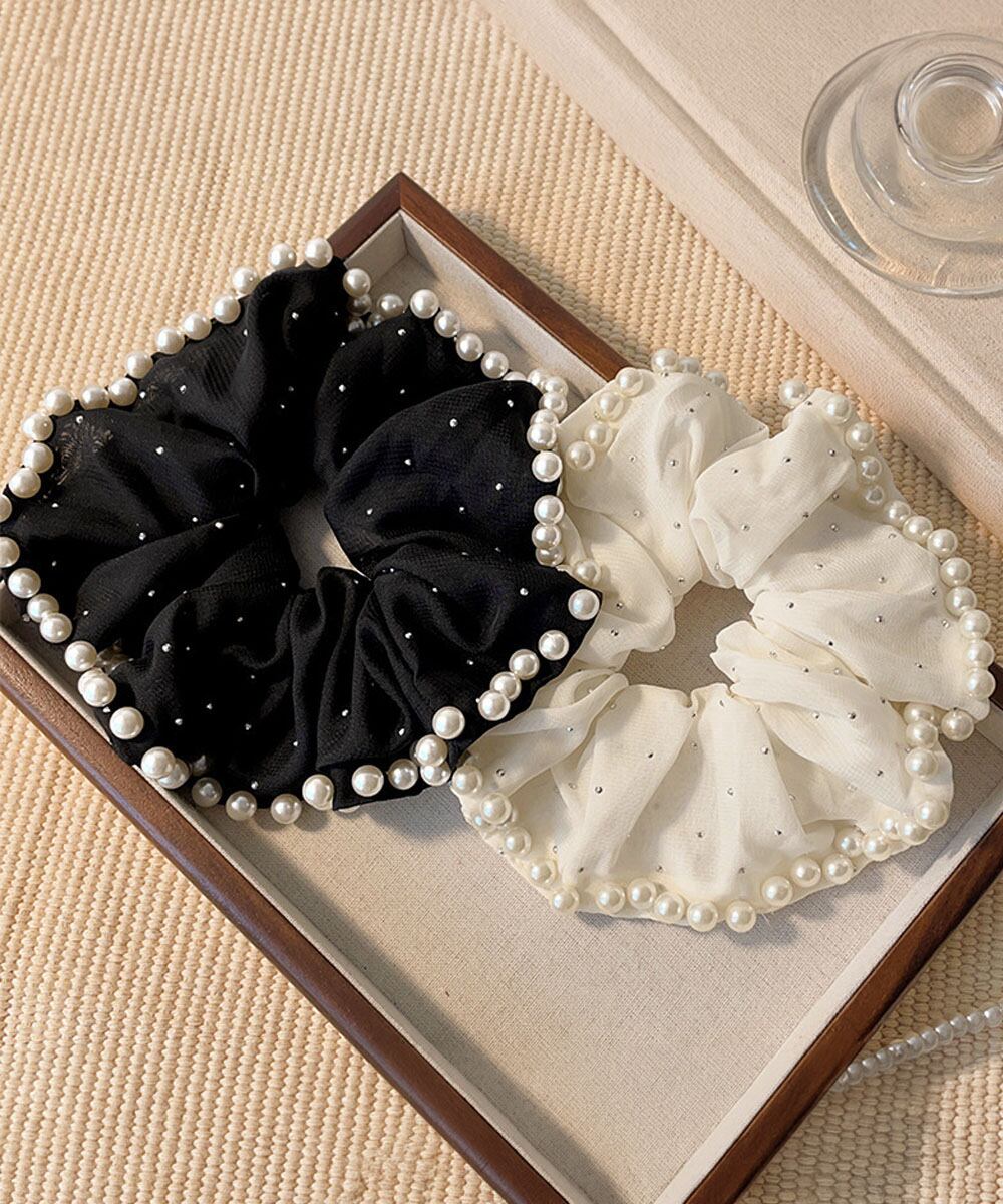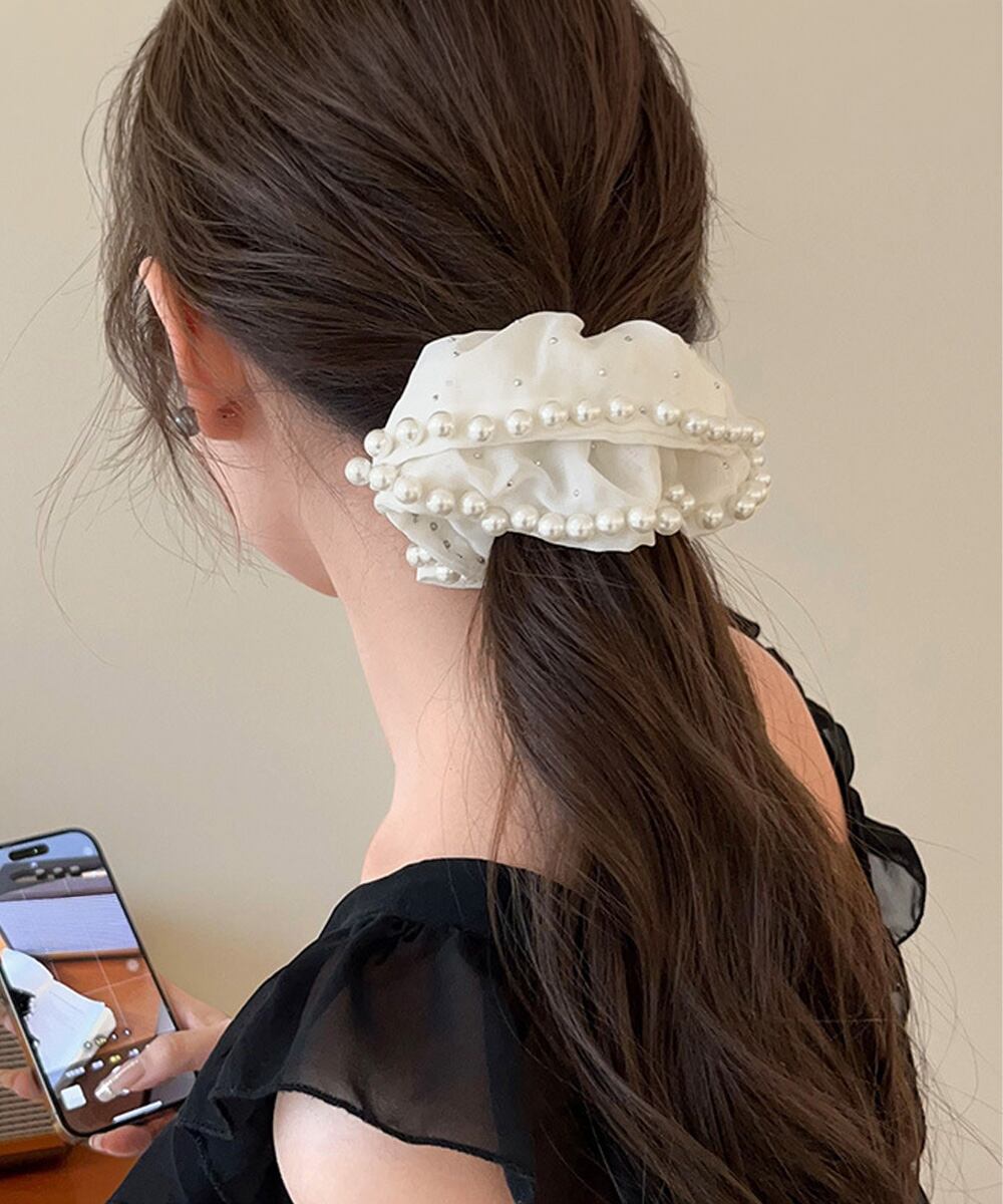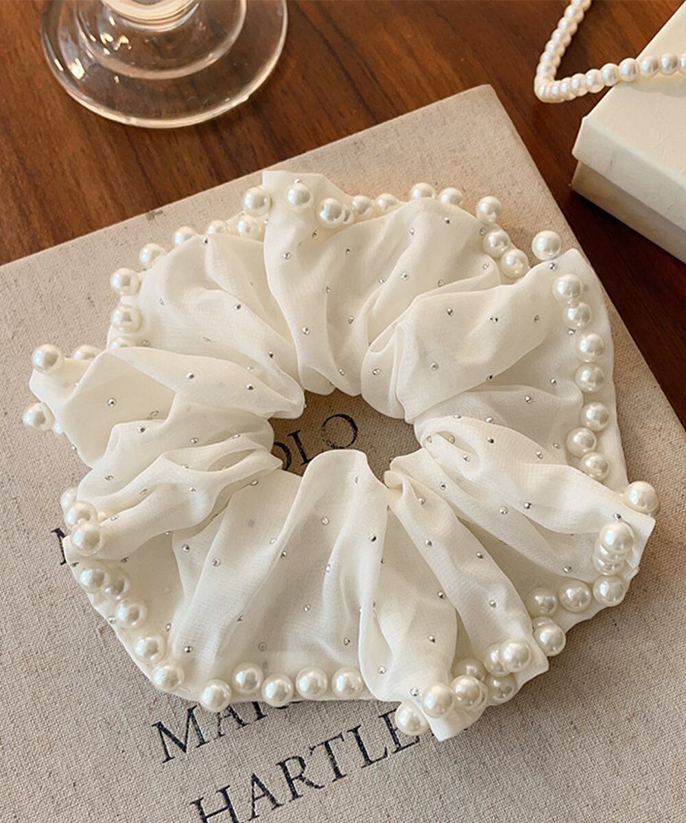 クラシカルな雰囲気漂う、フェイクパール付きボリュームシュシュ。