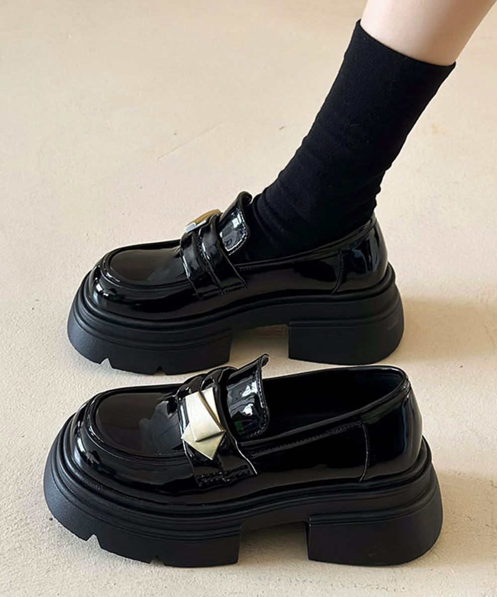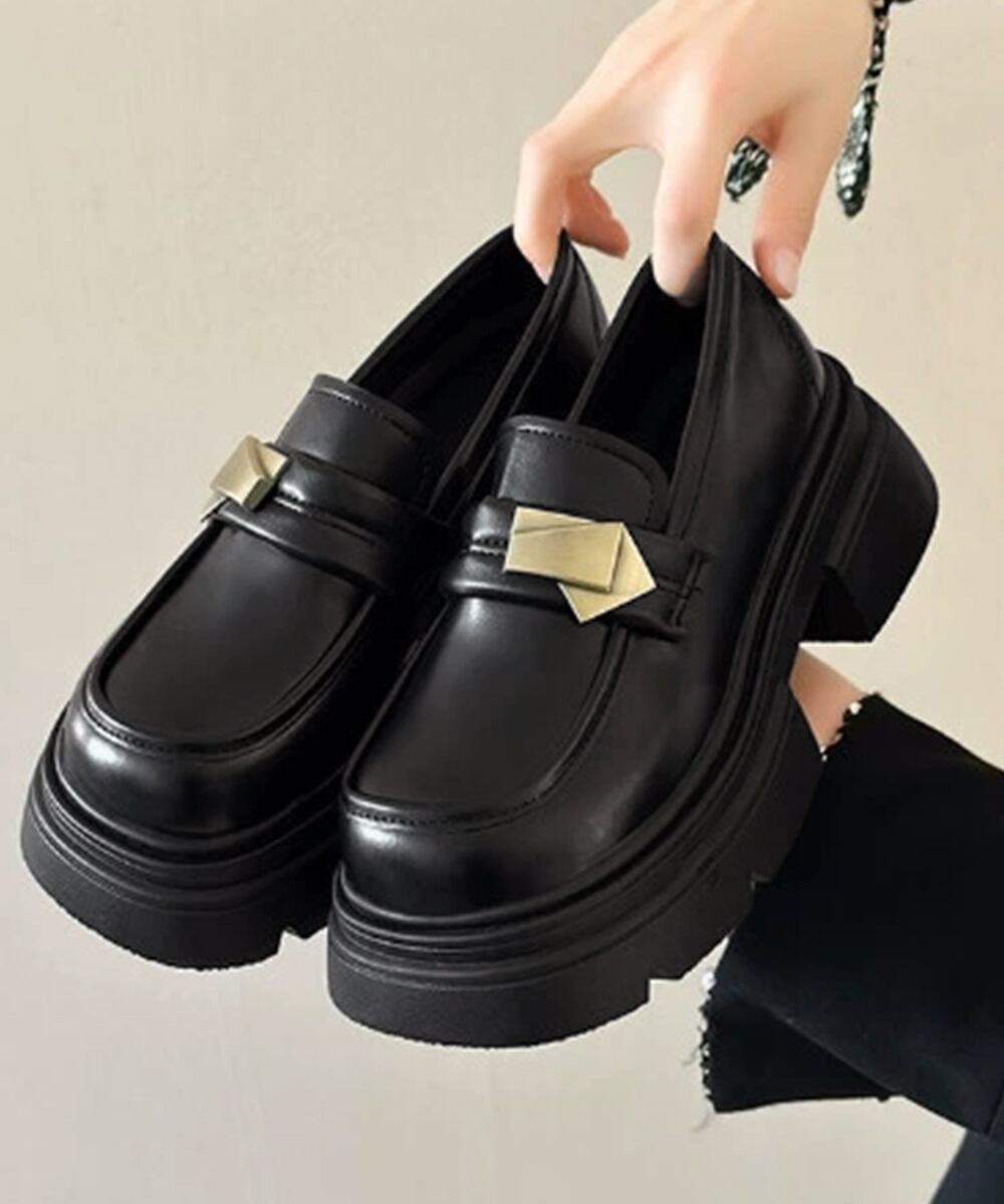 ボリューム感のある厚底ソールと、メタルモチーフが映えるローファーシューズ。
