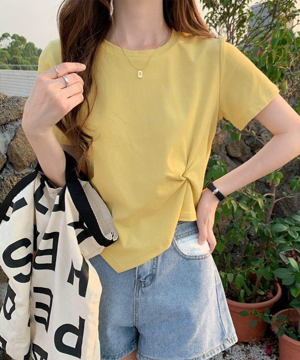 ウエストタックtシャツレディース カジュアルトップス春夏 シンプルカットソー無地 ショート丈 大人可愛いtシャツ お洒落