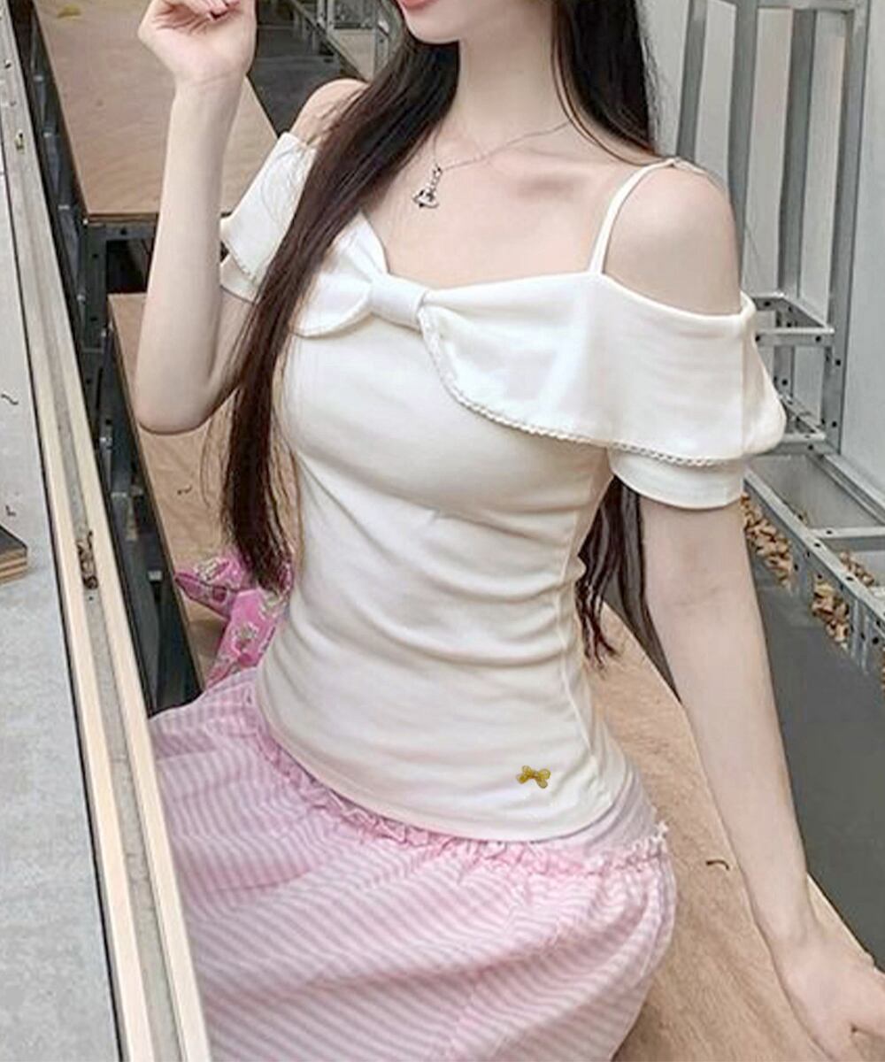 ビッグリボンオフショルカットソー 韓国風 きれいめトップス 大人可愛いカットソー肩見せ デコルテ見せトップス華奢見え夏服