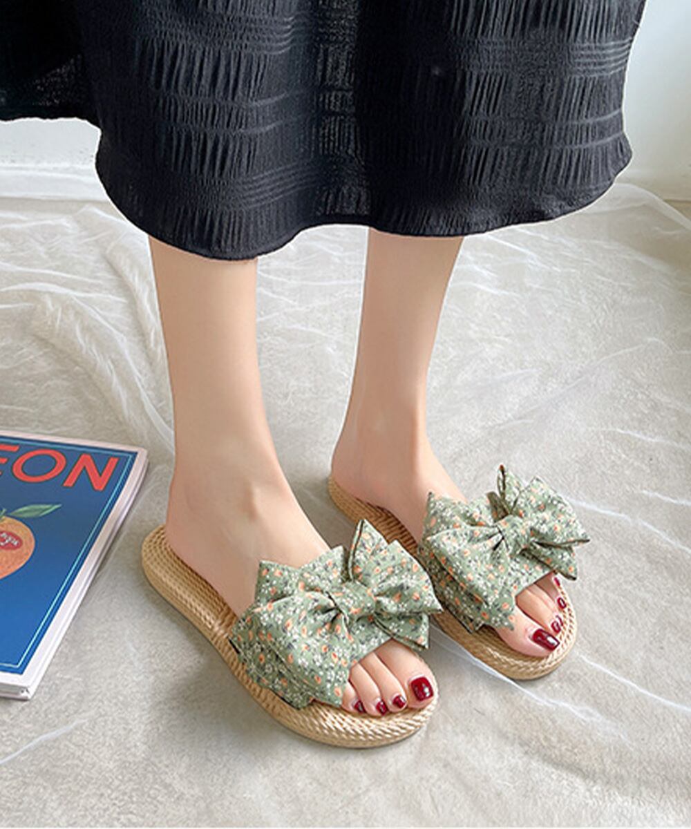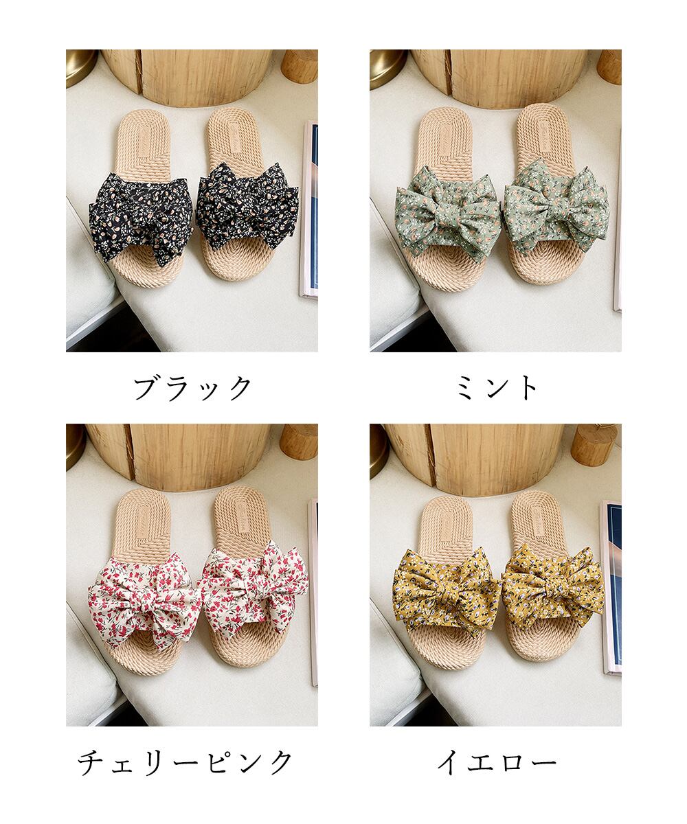 ナチュラルな風合いのソールに、小花柄の大きめリボンが目を引くフラットサンダル。
