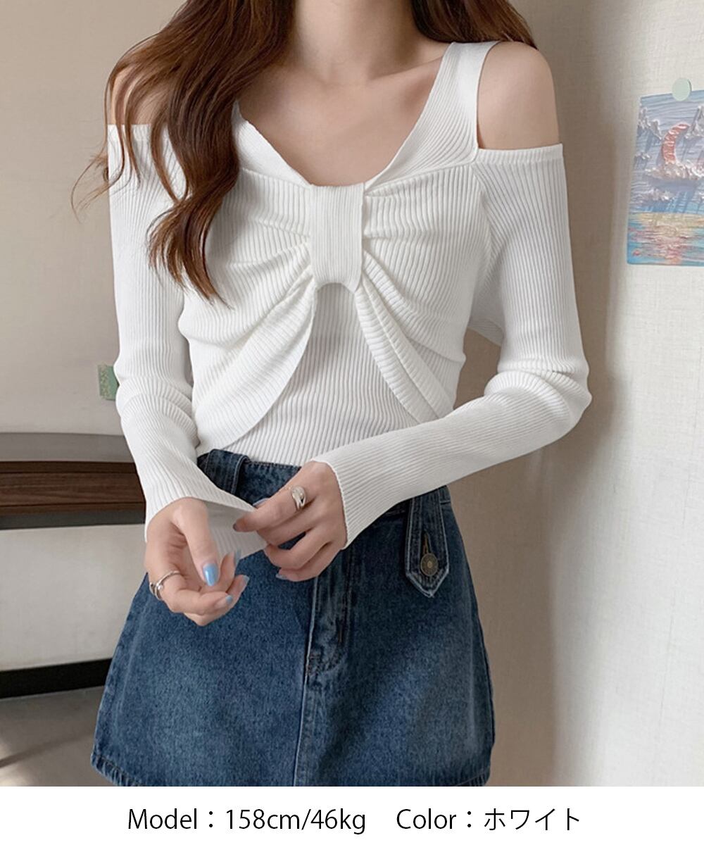 【日本倉庫即納】 フロントリボンリブニットトップス大人薄手
