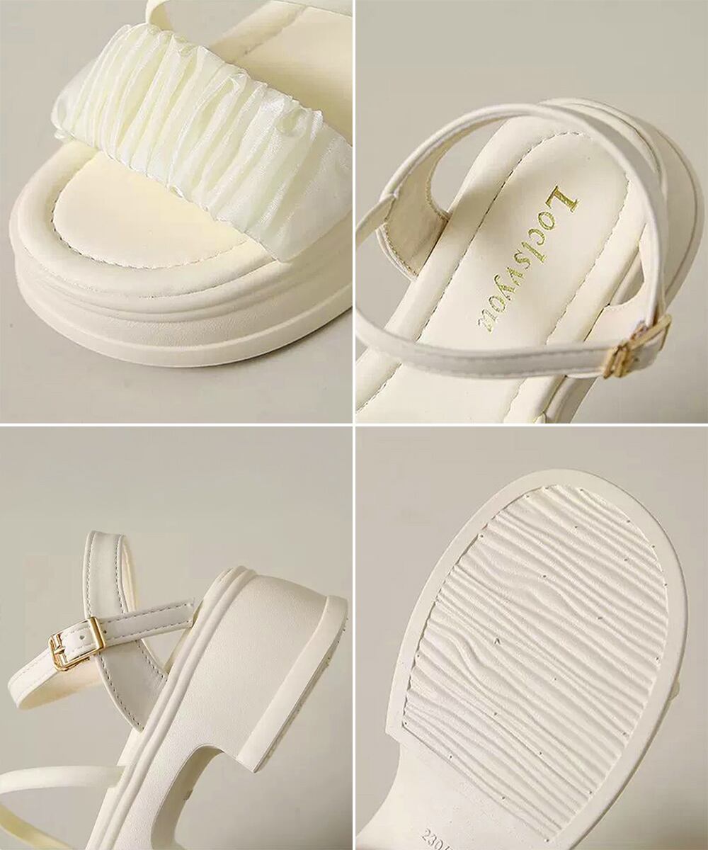 クシュっとしたフリルベルトが足元に華やかさを添える、トレンド感のある厚底サンダル。