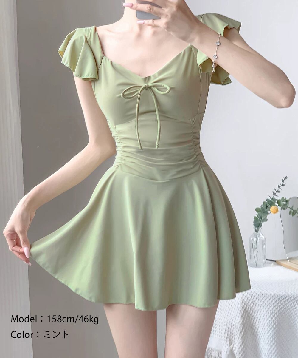 フリル袖ミニワンピ水着 大人可愛いリボン付き ウエストシャーリング水着 Vネック 夏海 露出控えめママ水着 ハイウエスト