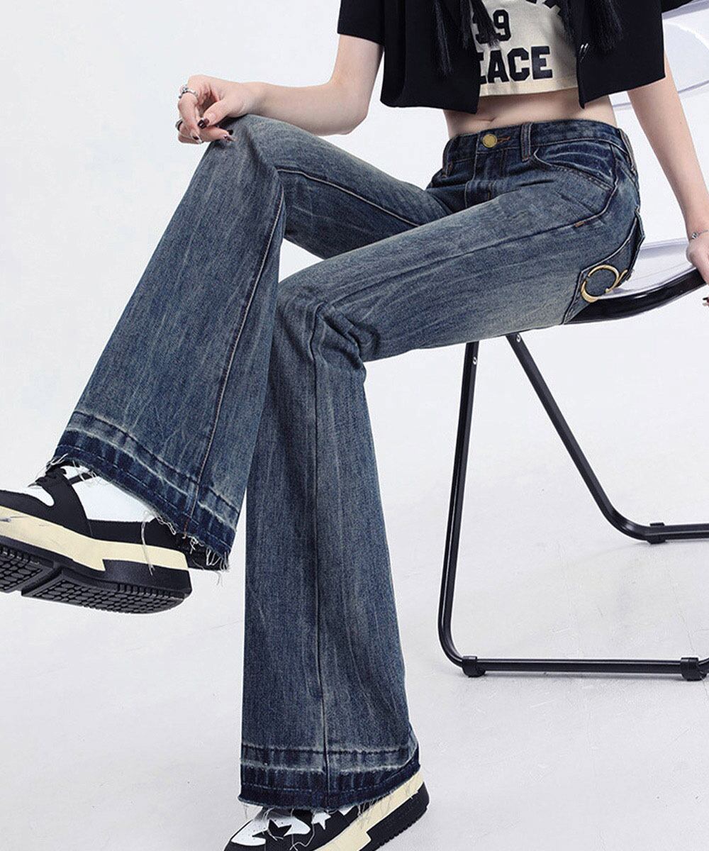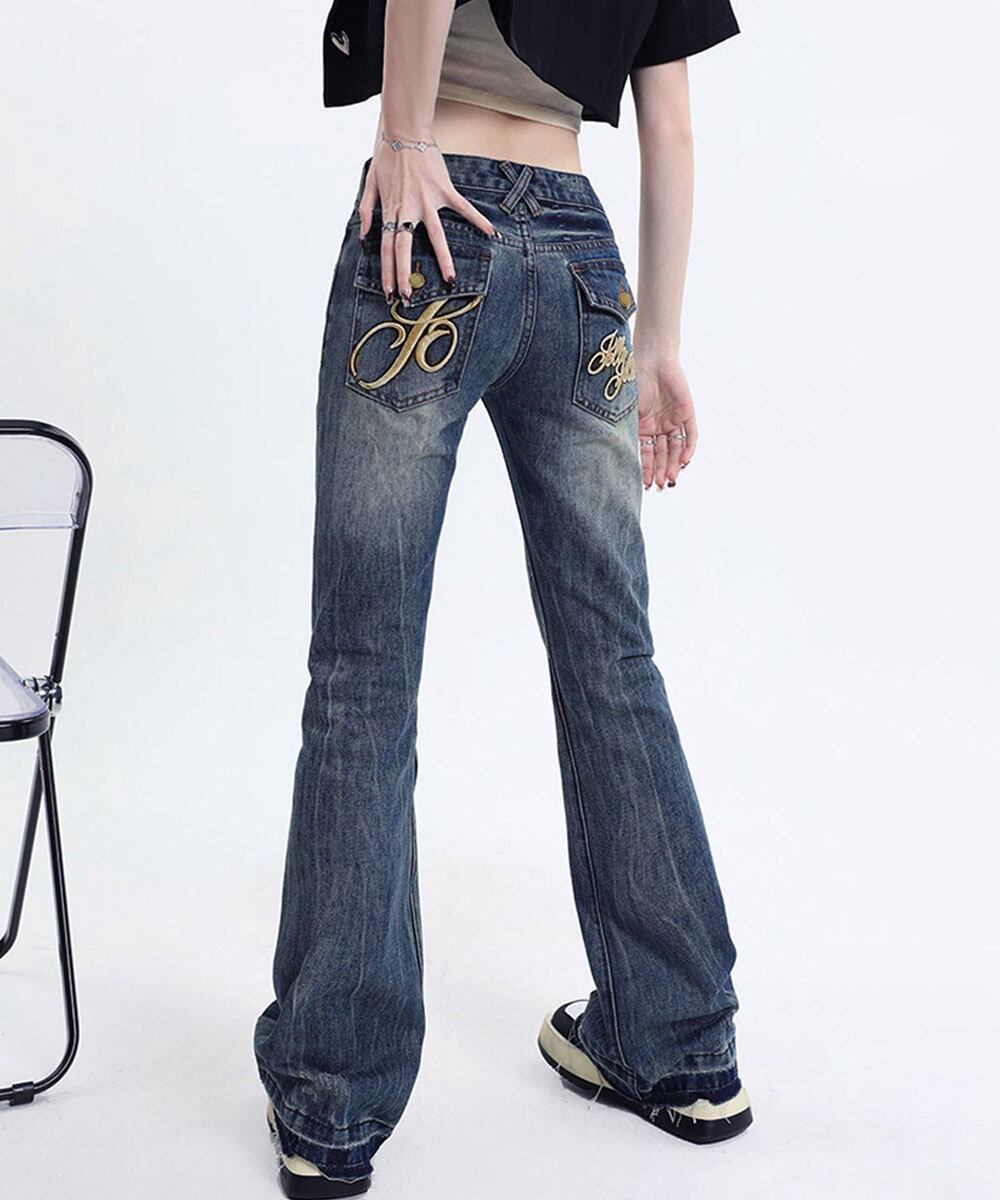 レトロ風ブーツカットデニム美脚脚長 ローライズベルボトム 足長見え カジュアルパンツバックポケット ワンポイント刺しゅう
