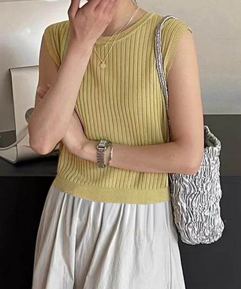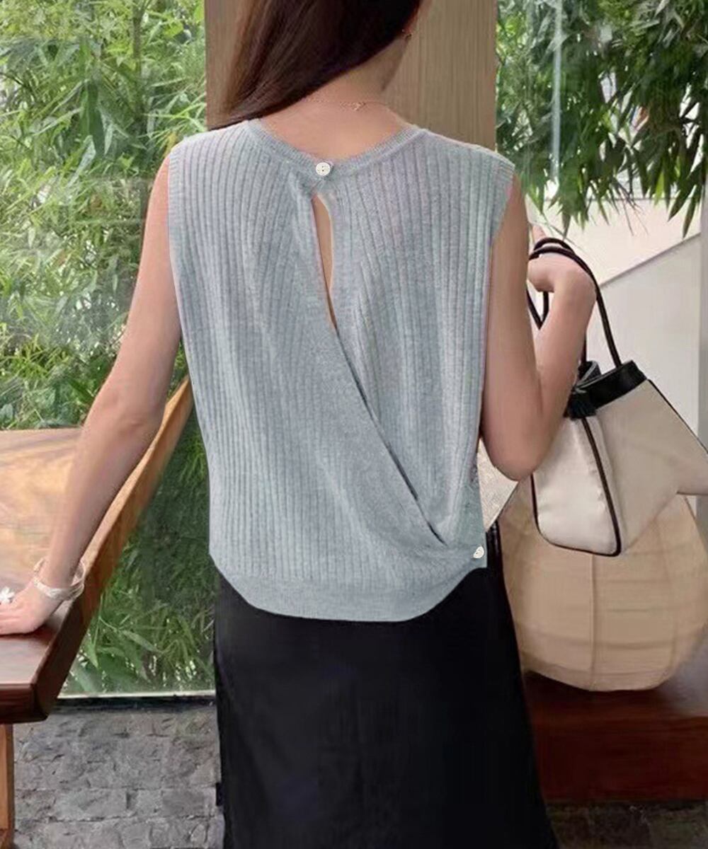 前後2WAYリブニット ノースリーブトップス レディース ラウンドネックプルオーバー バックオープンニットソー きれいめ