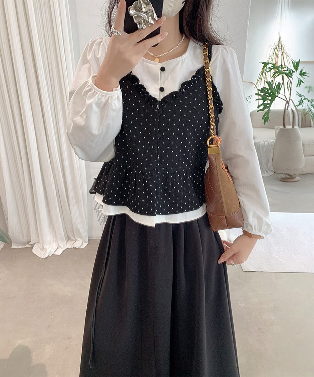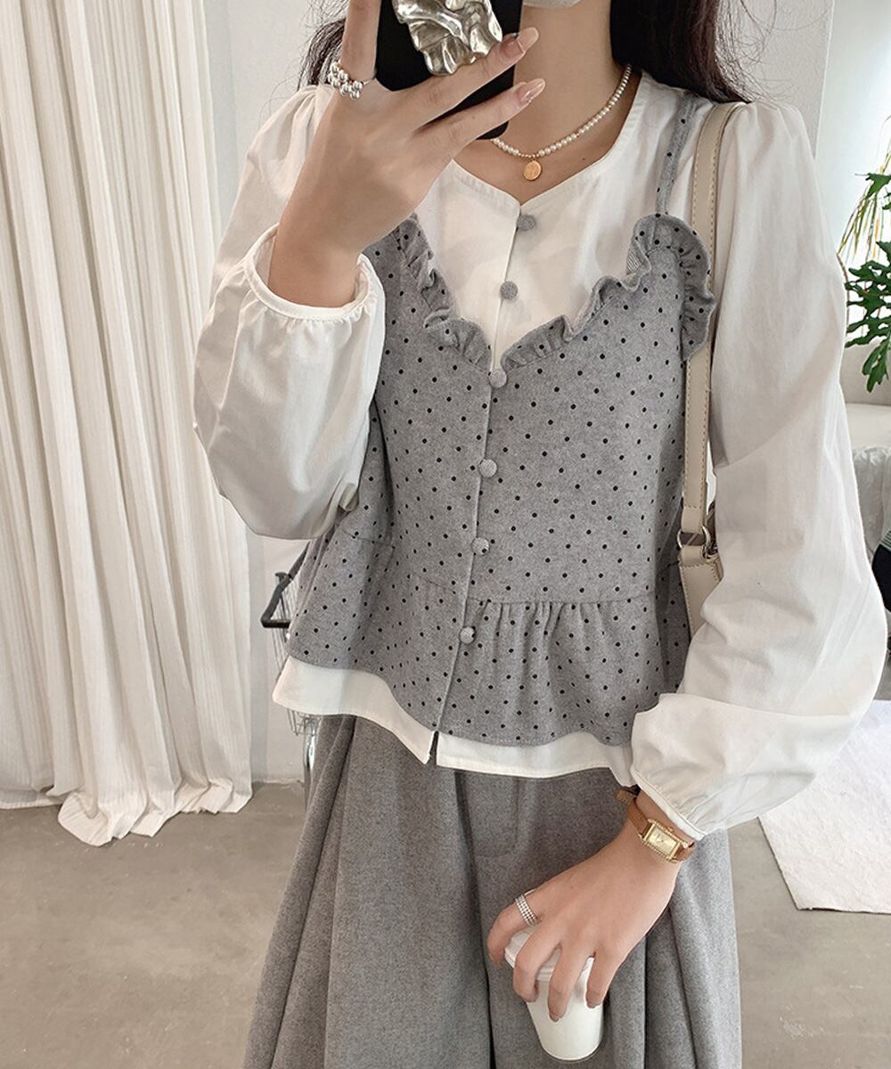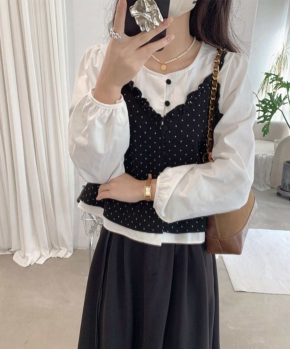 ドット柄ビスチェを重ねたようなフェイクレイヤード風長袖ブラウス。