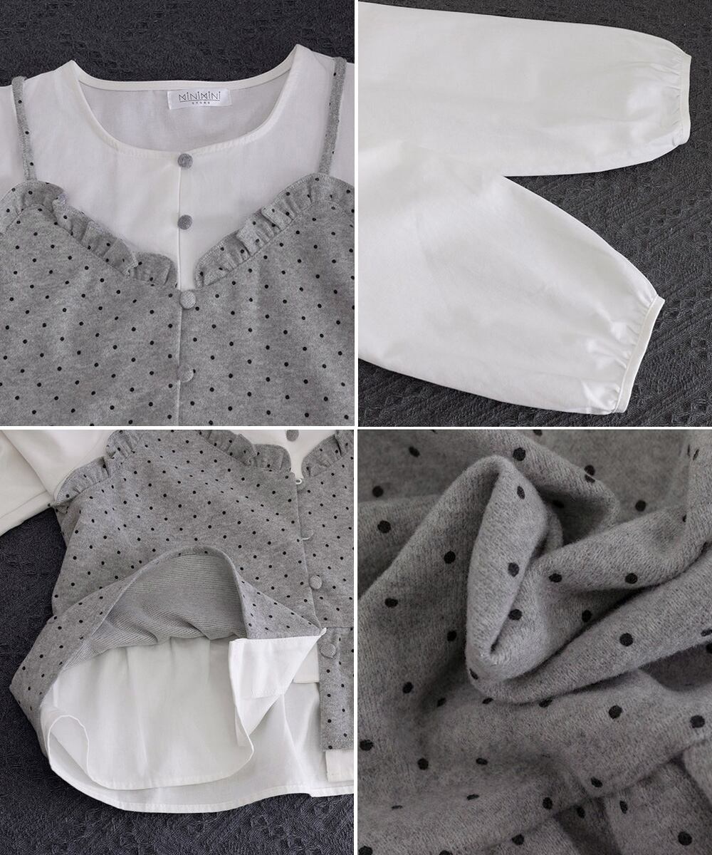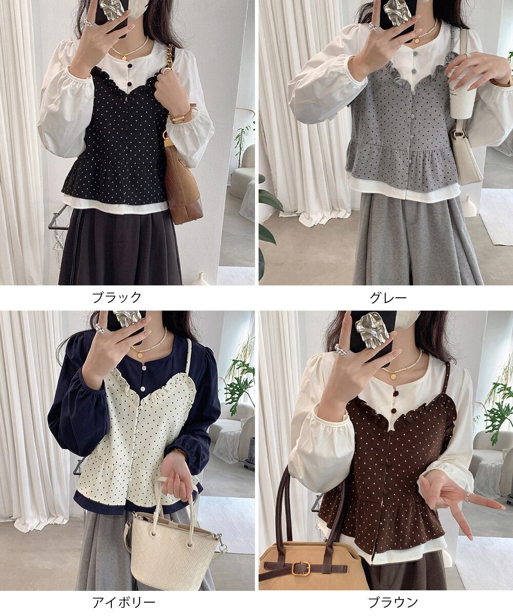 【日本倉庫即納】 ドット柄ビスチェレイヤード風ブラウス長袖