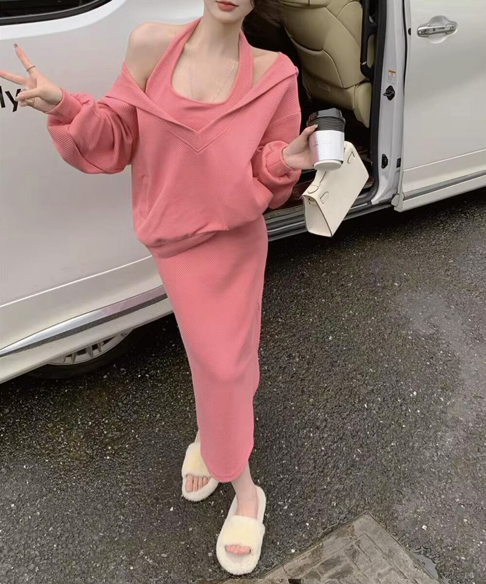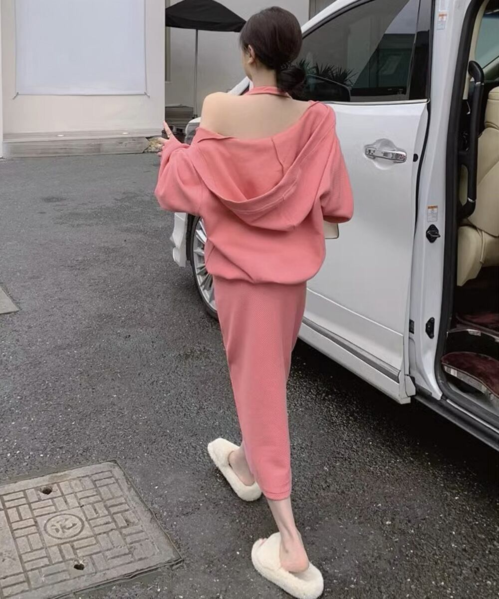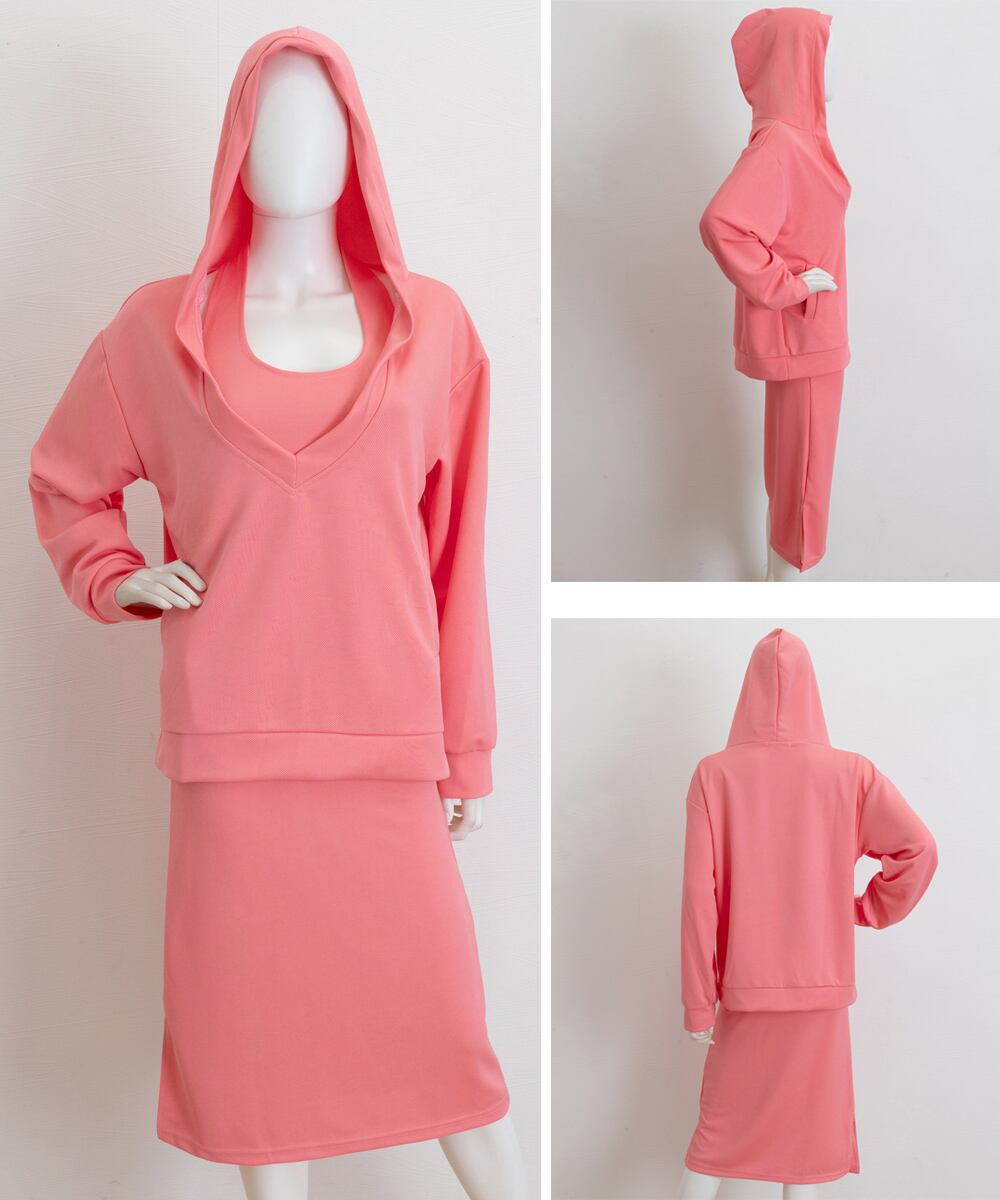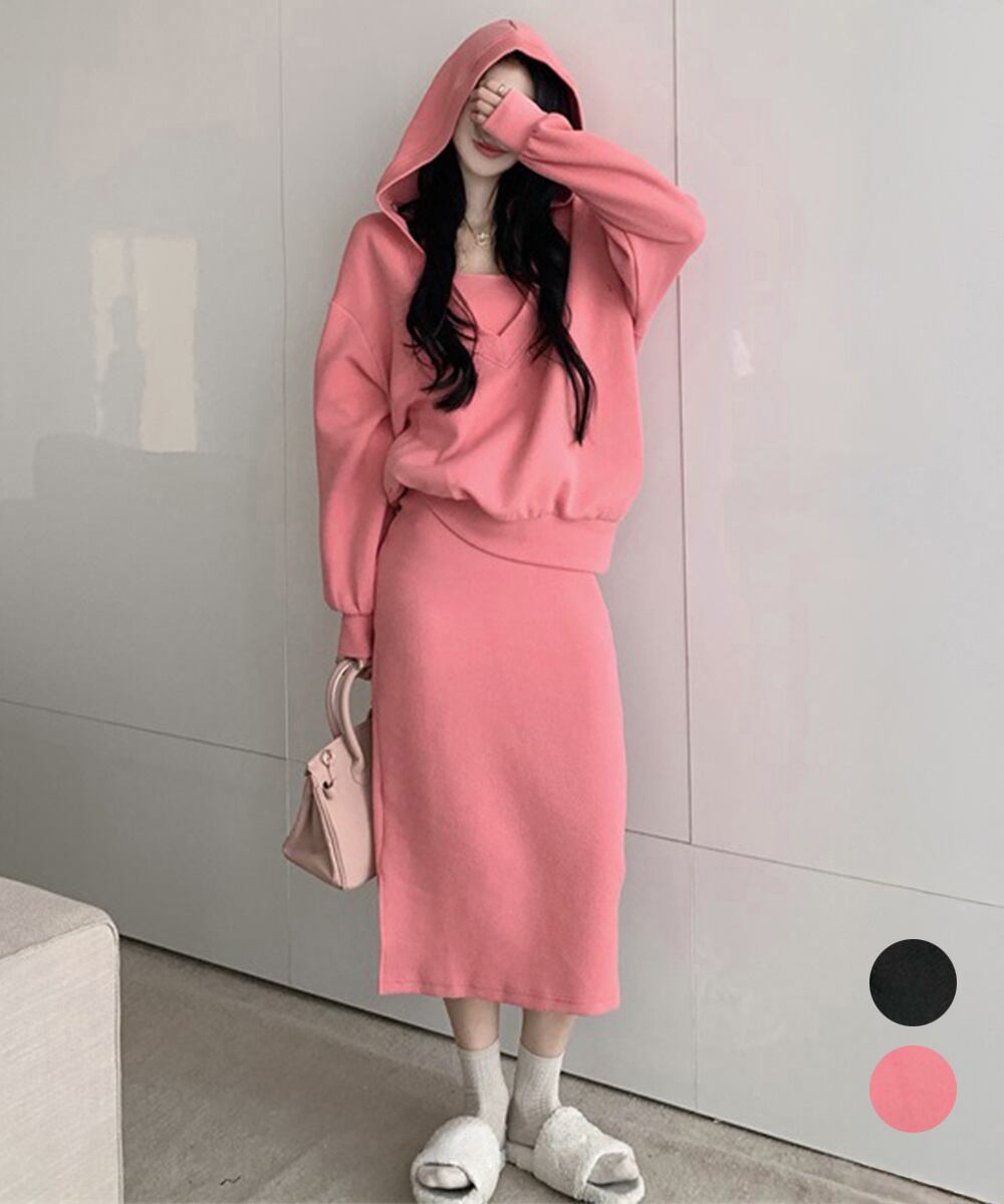 フーディー風トップスとロングワンピで大人可愛く映える上下2点セットアップ。