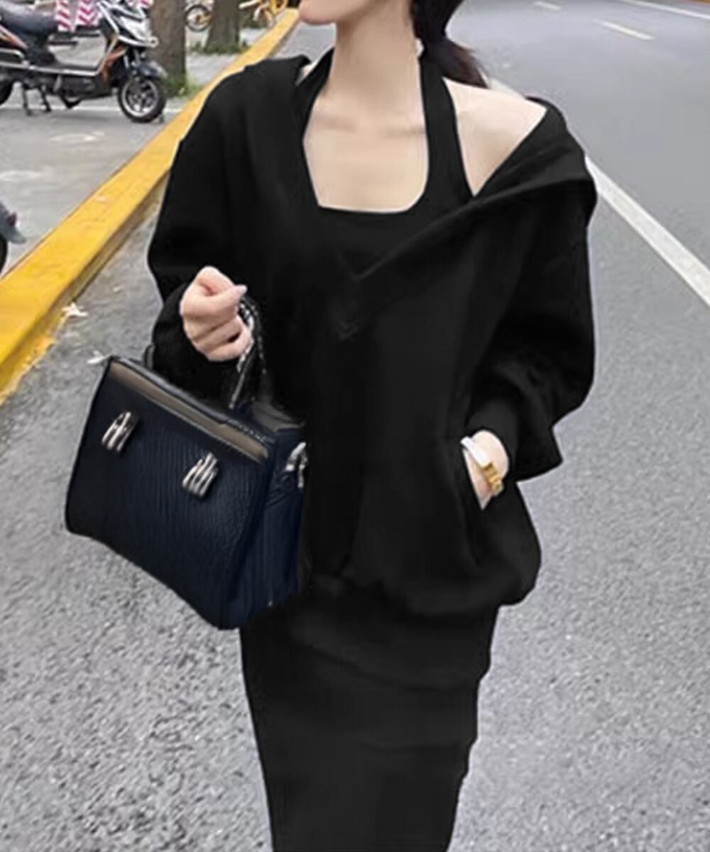 フード付きVネックトレーナーレディースドロップショルダー ホルターネックロングワンピース サイドスリットワンピースお洒落