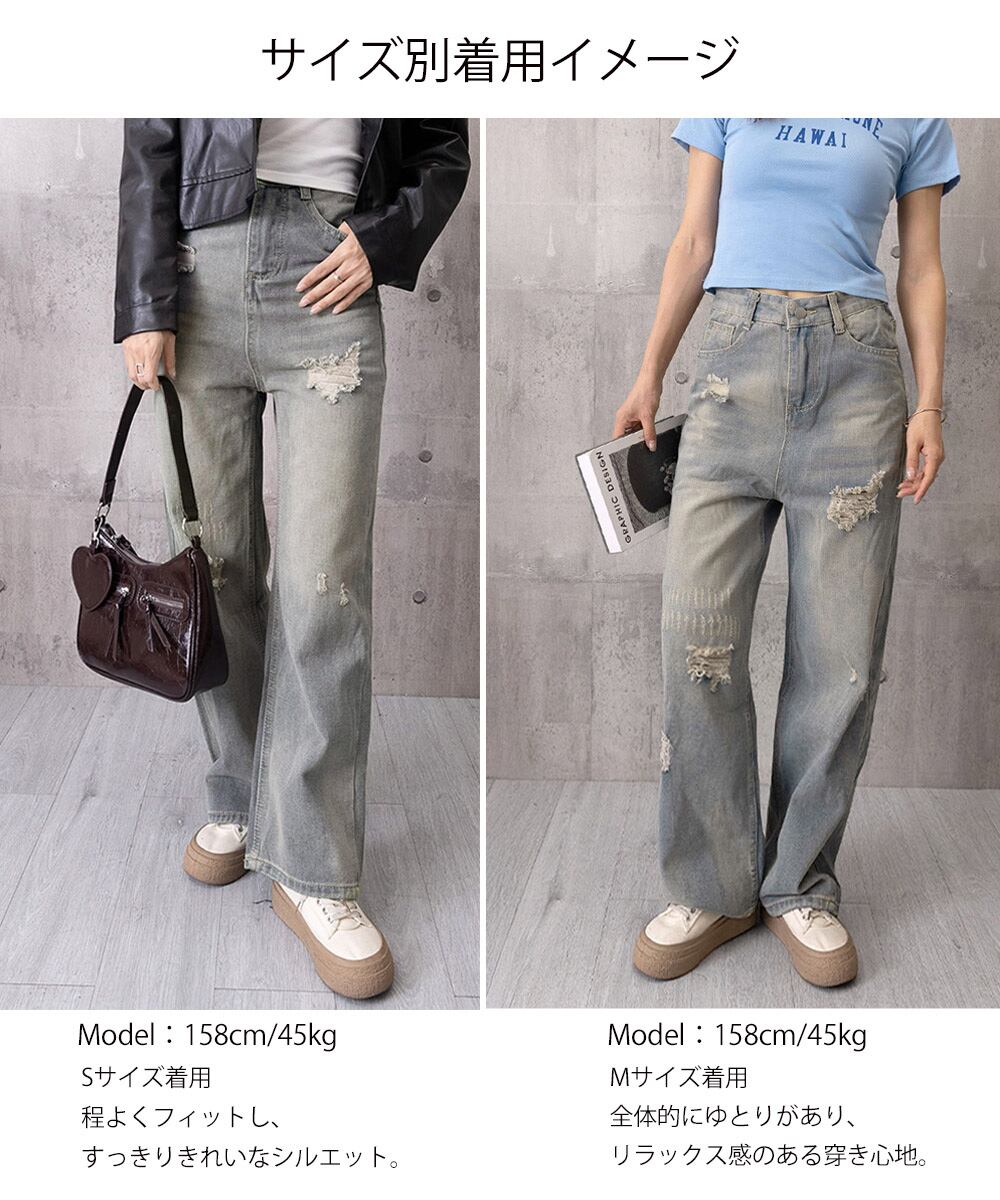 アメリカンヴィンテージテイストを取り入れた、ダメージ加工入りのレディースデニムワイドパンツ。