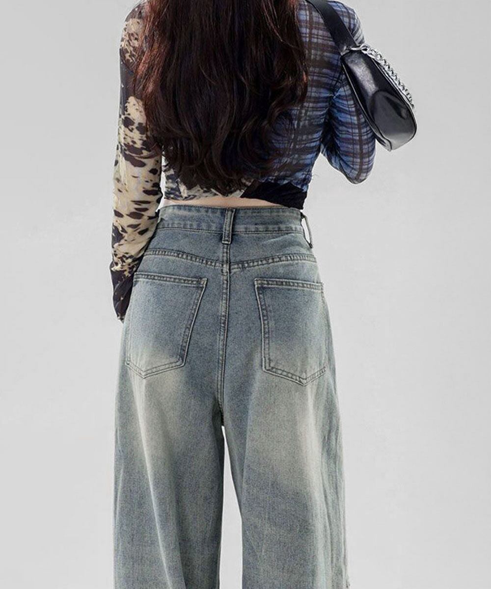 ハイウエストウォッシュ加工デニム 着やせ ストレートデニムおしゃれ カジュアルパンツ アメカジデニム ビンテージジーンズ