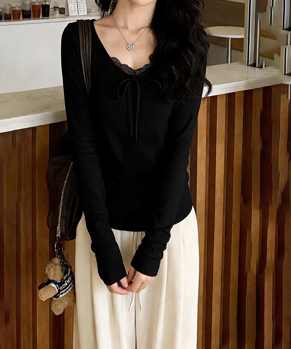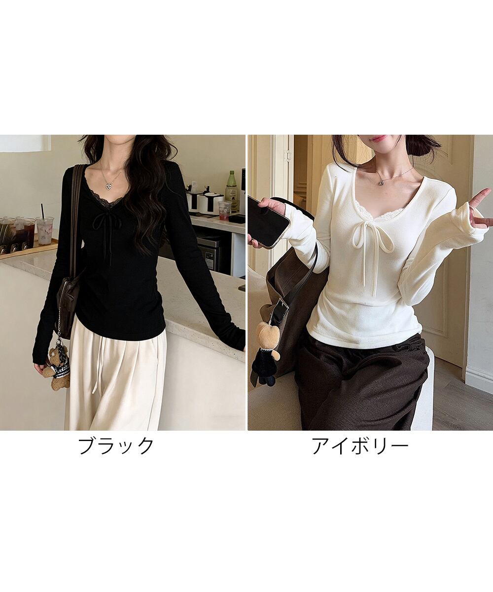 レースのネックラインとフロントリボンが可愛らしい、フェミニンな長袖トップス。