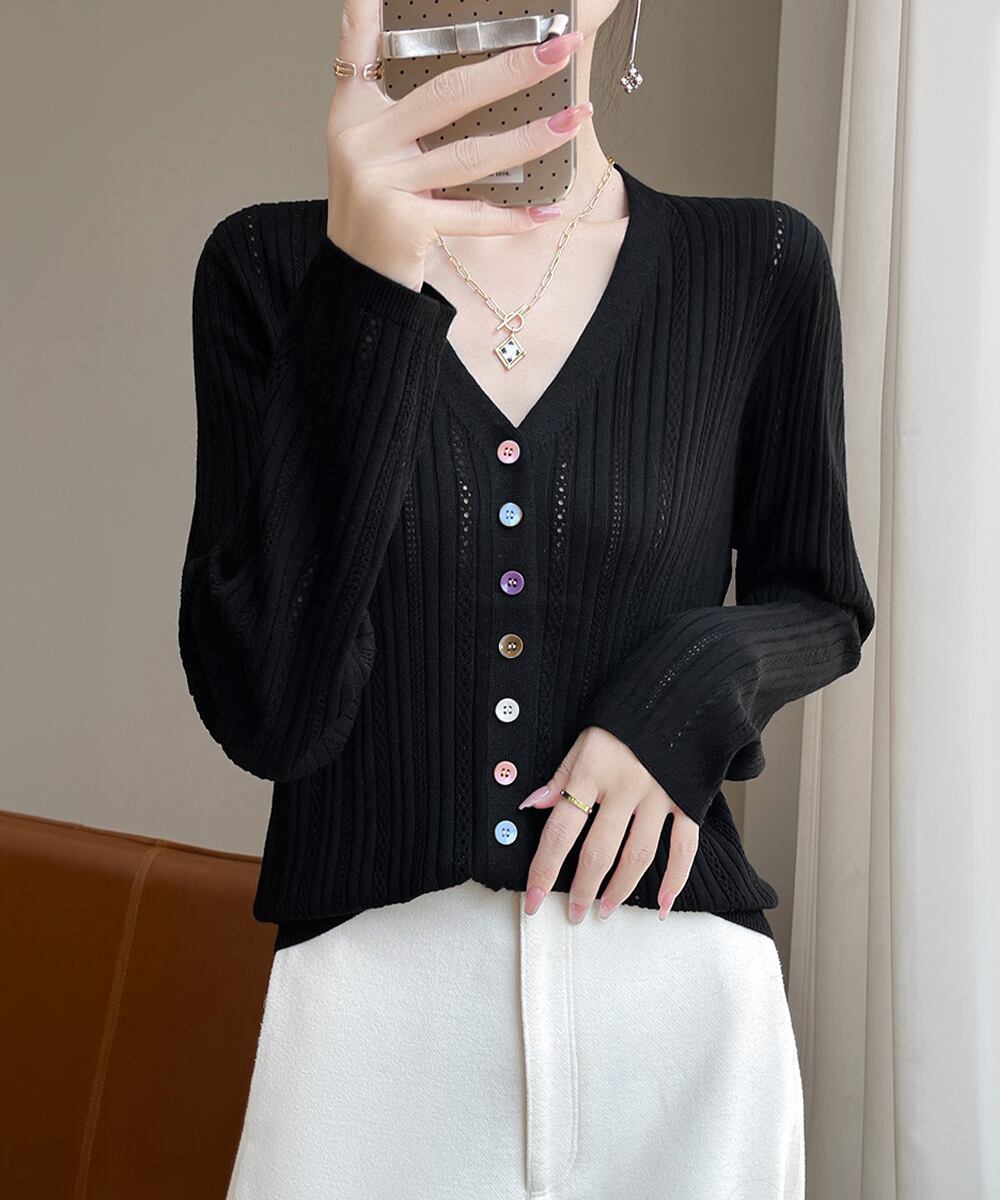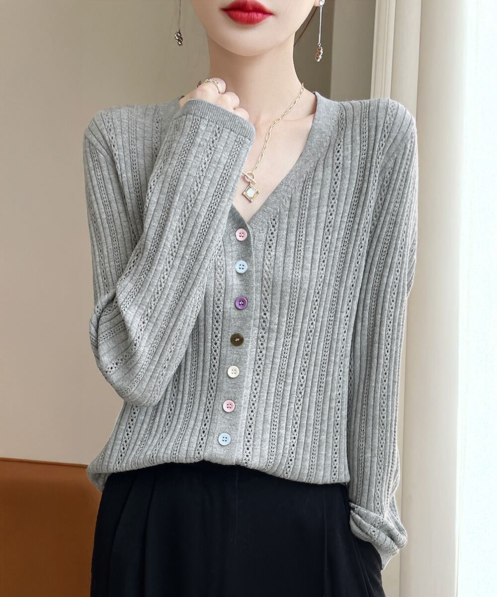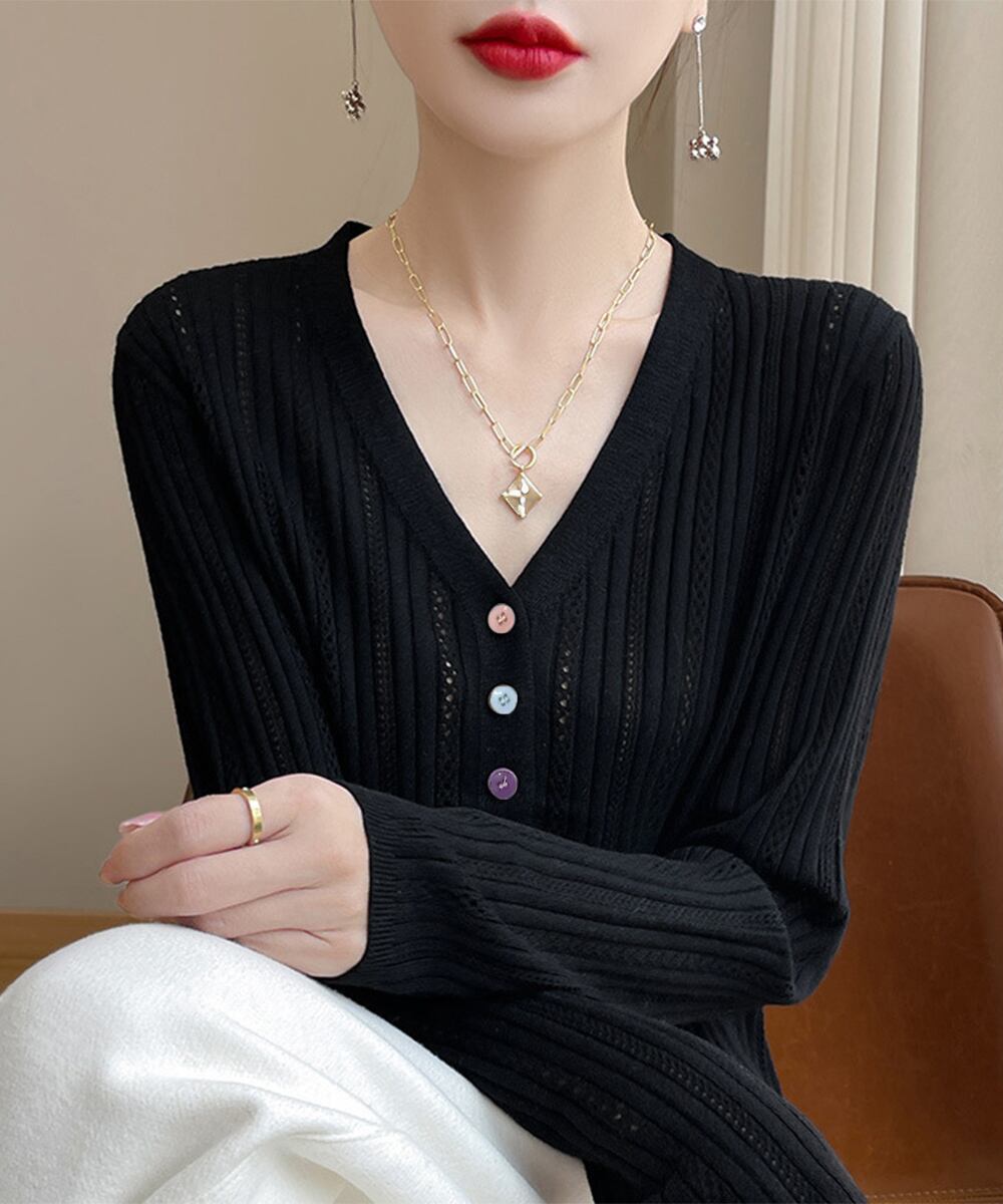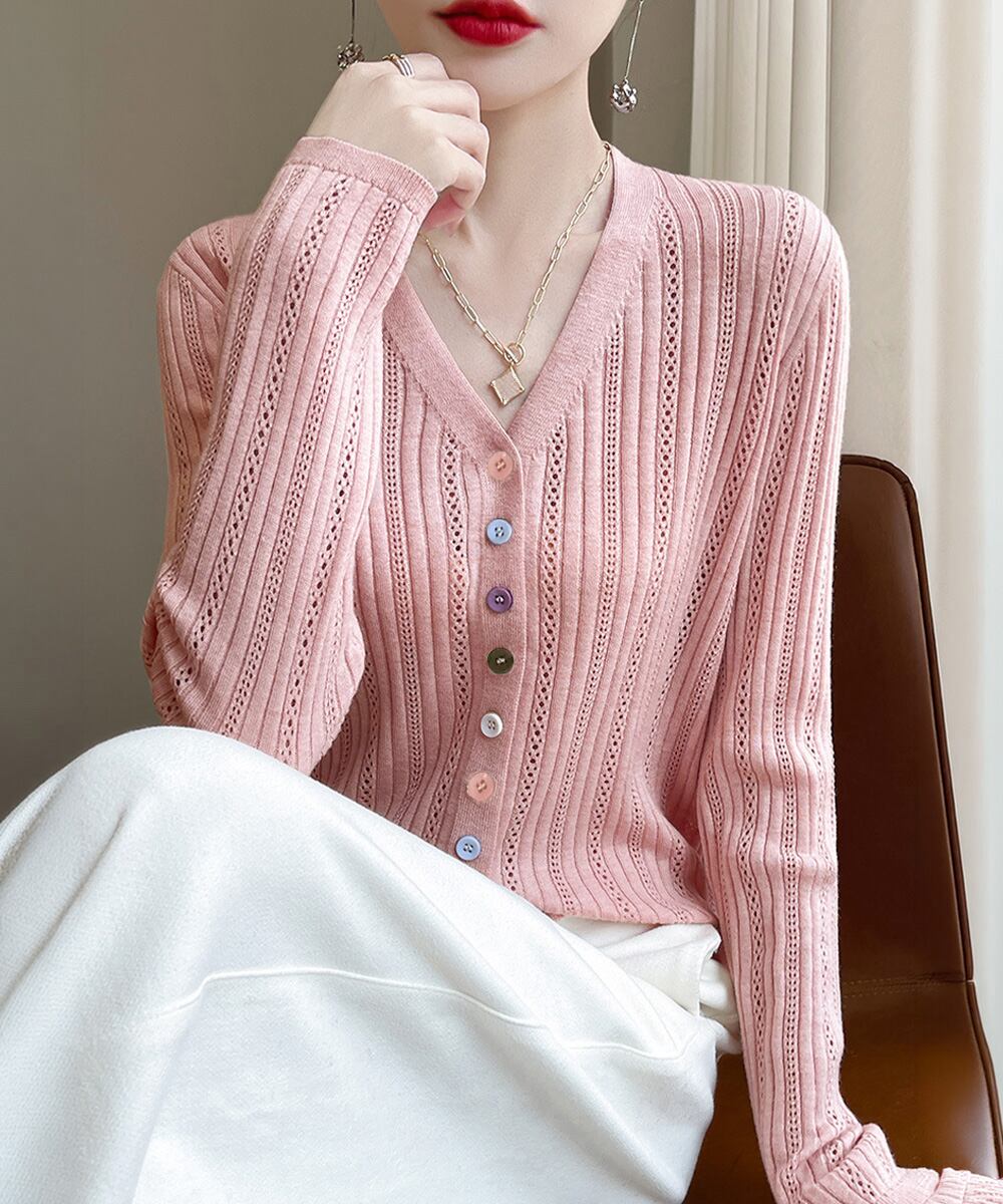 Vネックカーデ長袖 透け感ニット着回し 針抜きニット韓国風