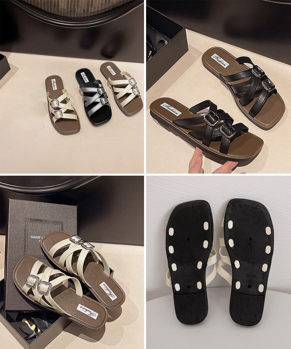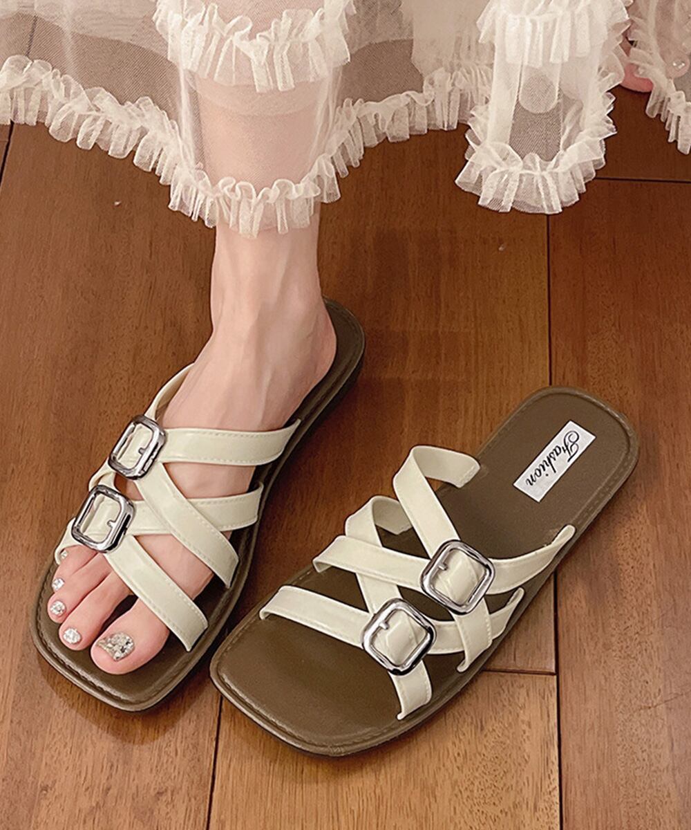 クロスデザインが目を引く、ダブルバックル仕様のフラットサンダル。