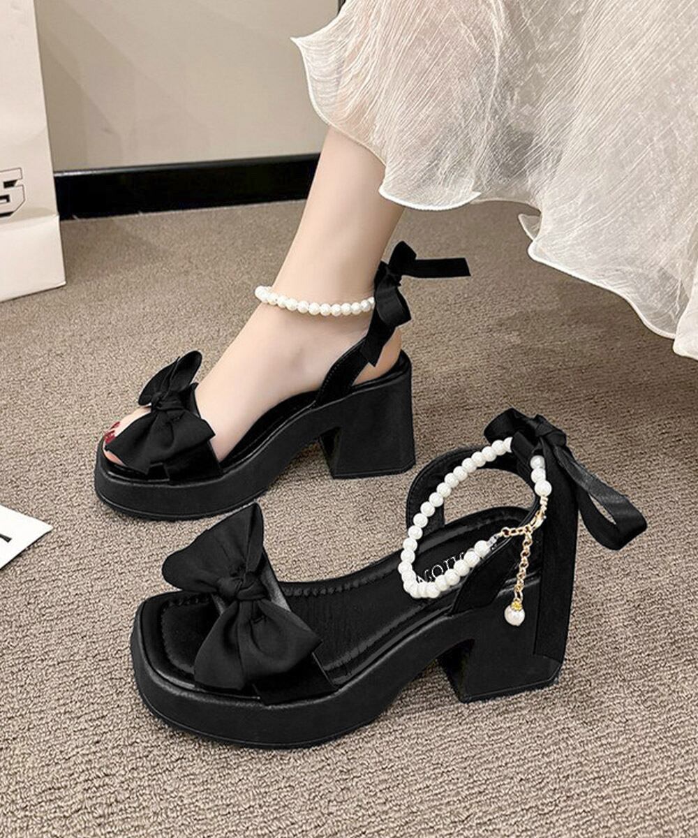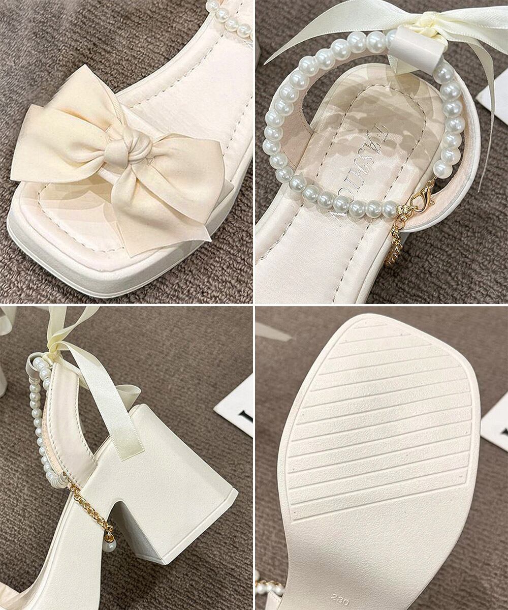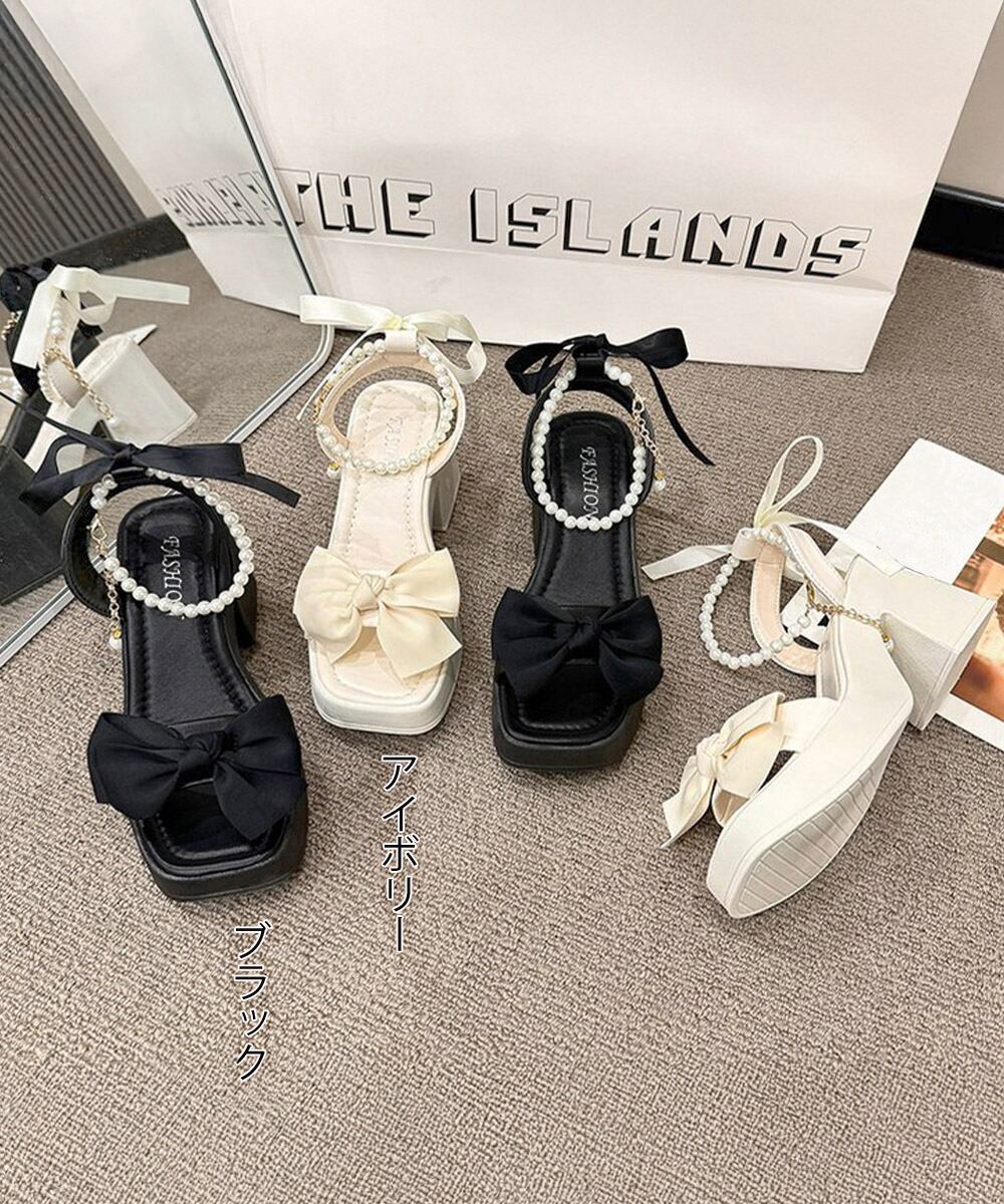【日本倉庫即納】 リボン厚底サンダル パールストラップ美脚