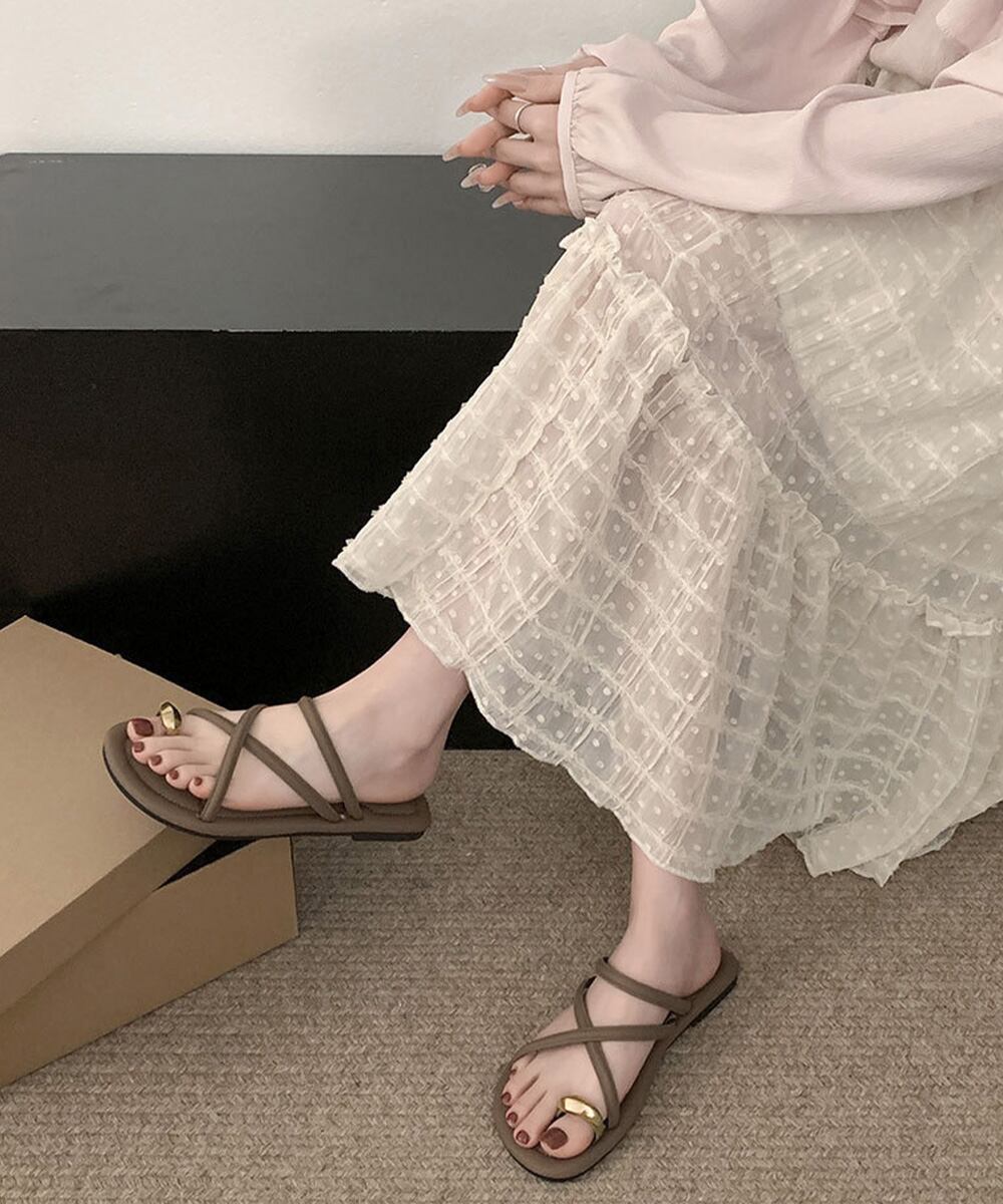 指部分にリング状のトングが付き、甲部分でクロスする細いストラップが特徴のフラットサンダル。