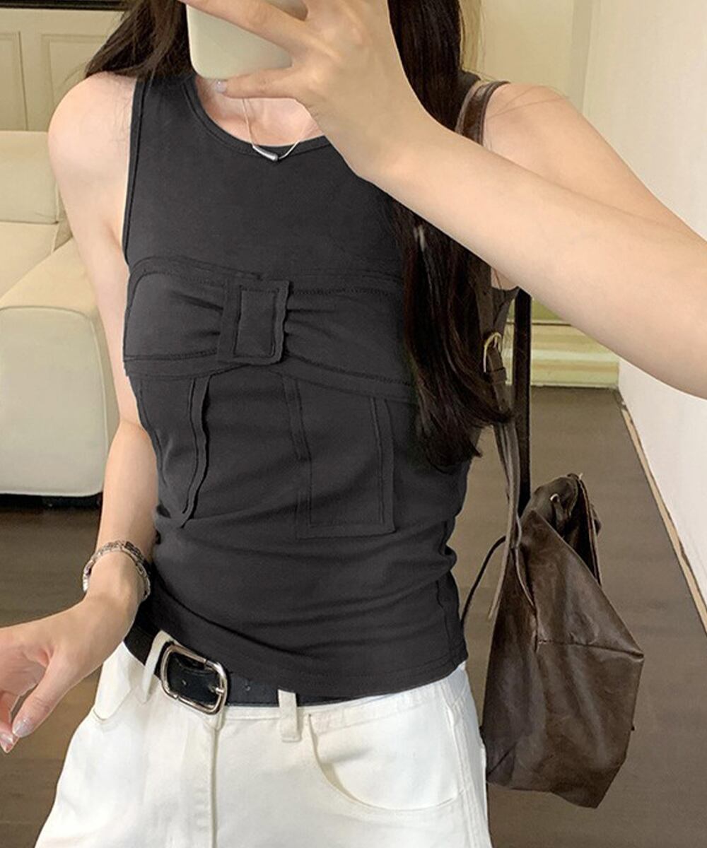 フロントに大きなリボンがアクセントの無地タンクトップ。