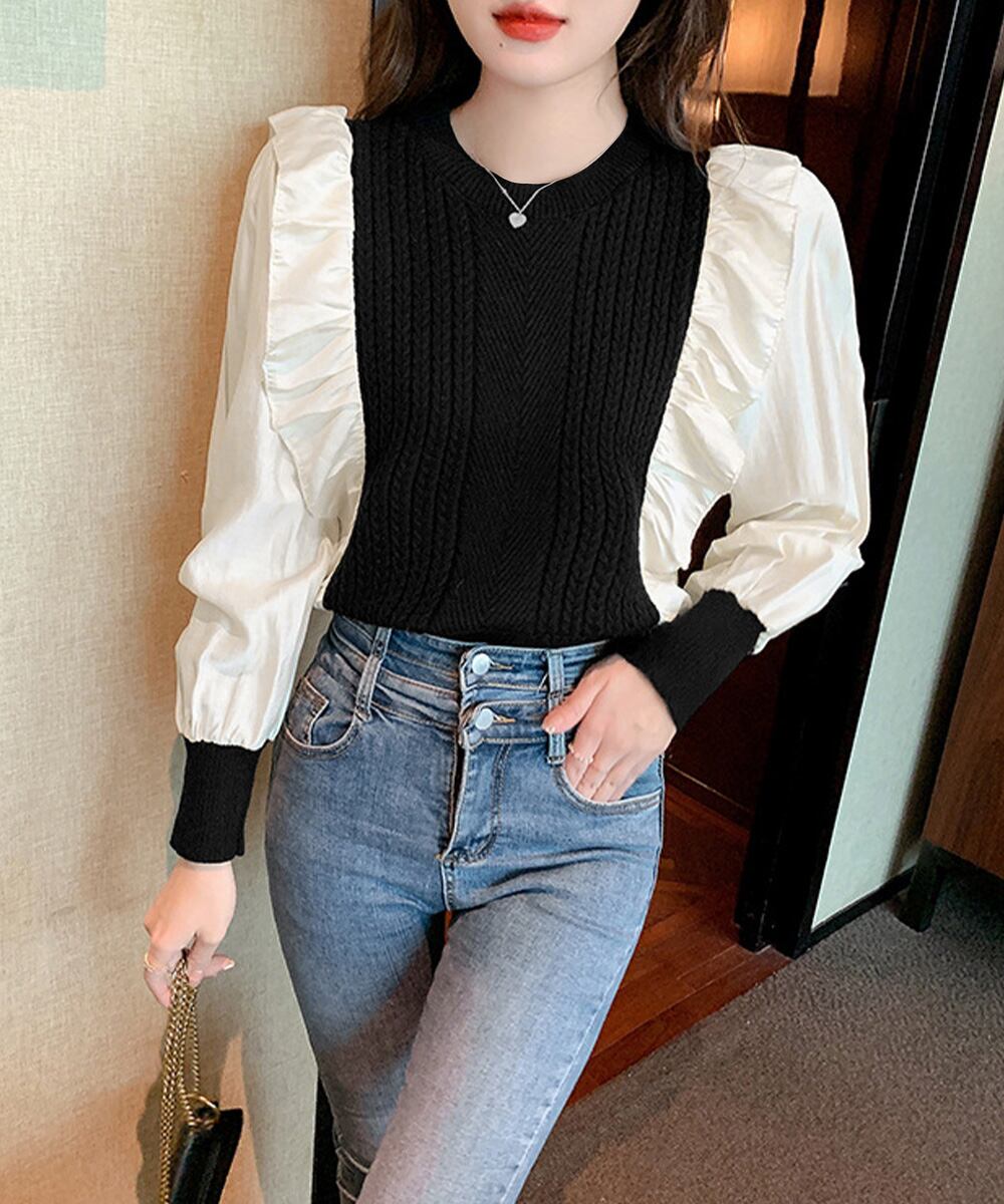 異素材mixニットブラウス レイヤード風 トップス ボリューム袖 ニットプルオーバー きれいめ ドッキングニットブラウス