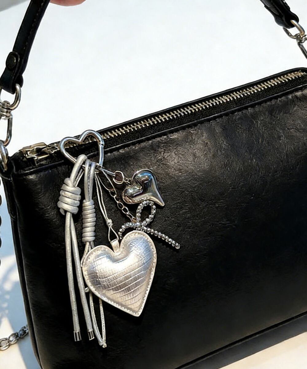 メタリックな光沢とクールな雰囲気が、フェミニンなハートモチーフと調和し、個性的な印象を演出。