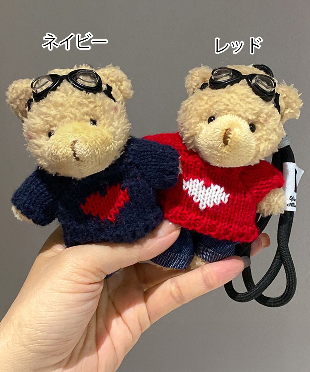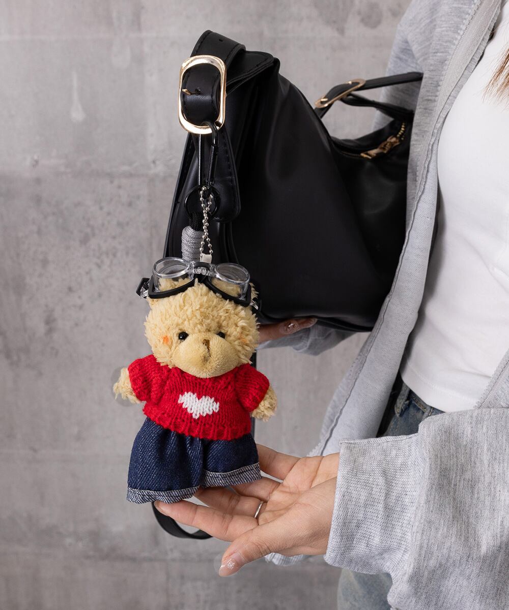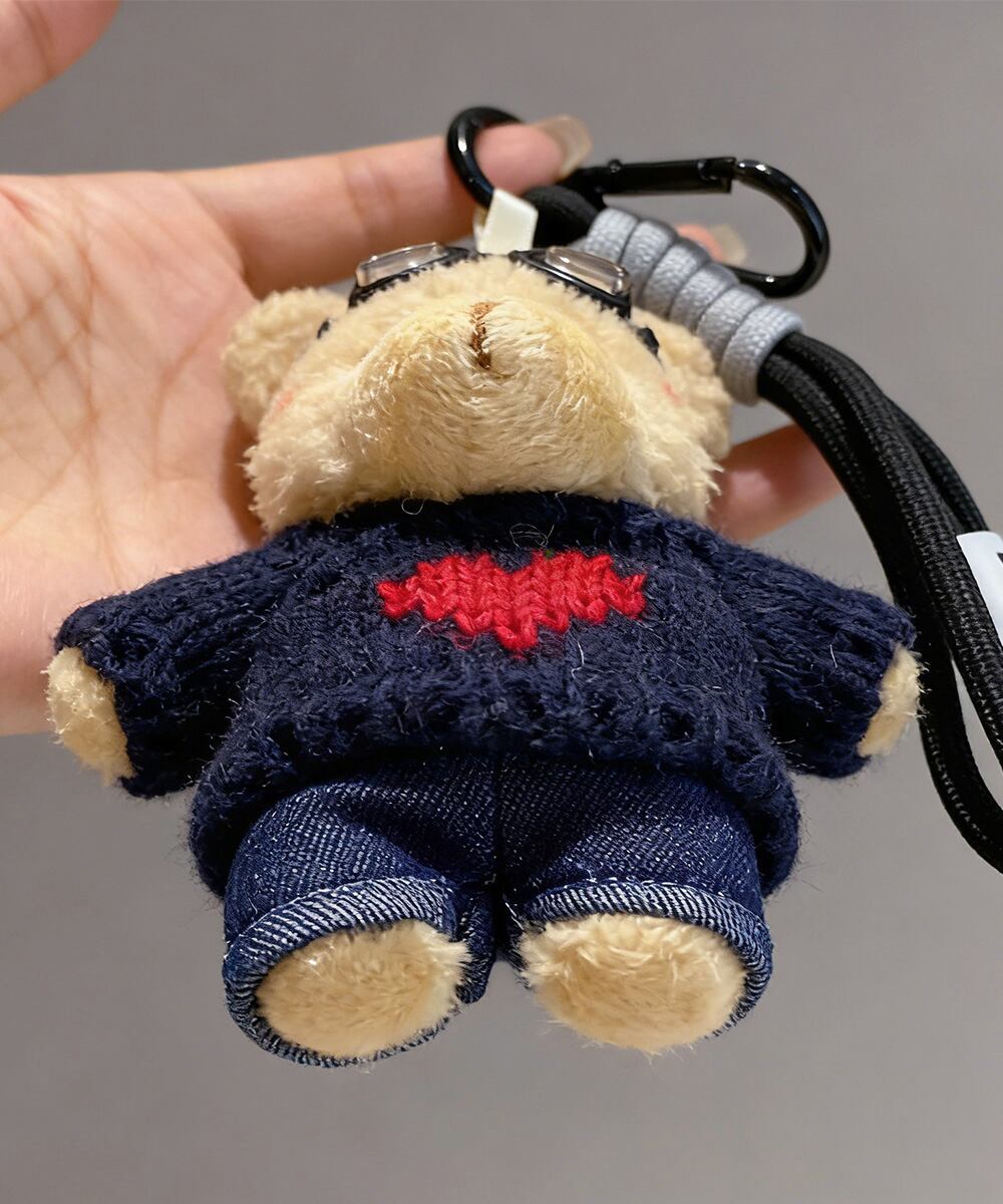 ハートモチーフのニットセーターとヴィンテージライクなゴーグルをかけ、スタイリッシュなデニムパンツを着用したくまさんのぬいぐるみチャーム。