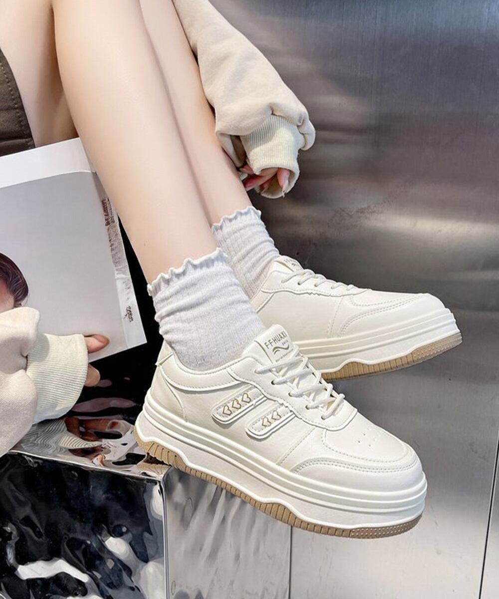 疲れにくい厚底くつ 着回しスニーカー白 レースアップ靴脚長