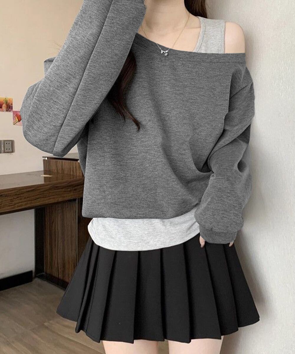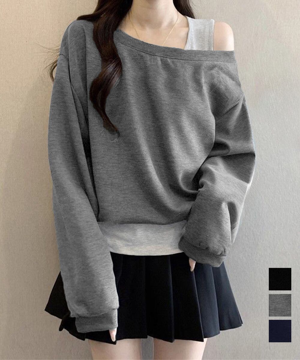 ゆったりとしたシルエットとオフショルダーデザインが特徴のレイヤード風スウェット。