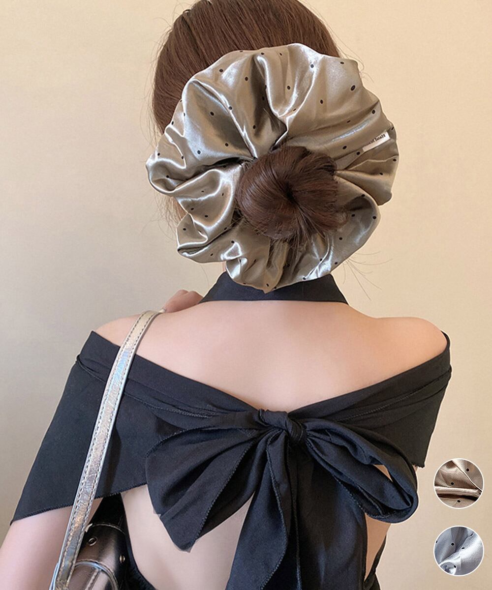 サテン素材を使用した、ボリューム感のある大判シュシュ。
