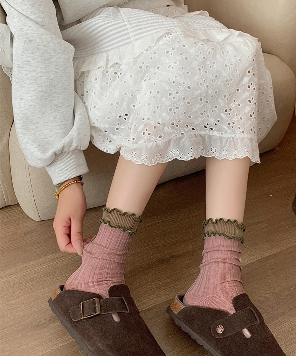 レトロ感のある配色が可愛い、2重フリル仕様のレディースリブソックス6色セット。