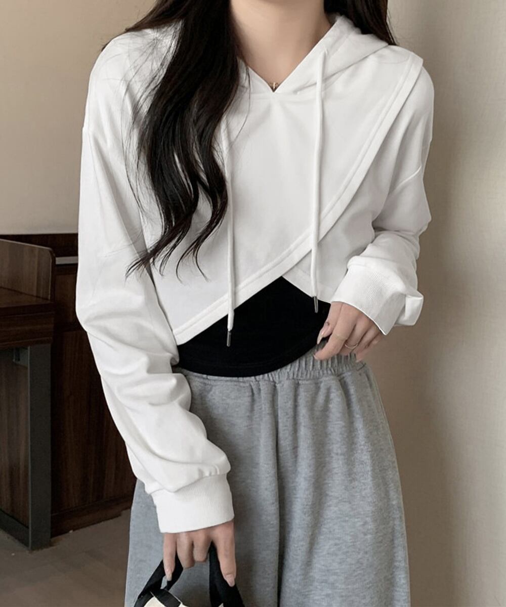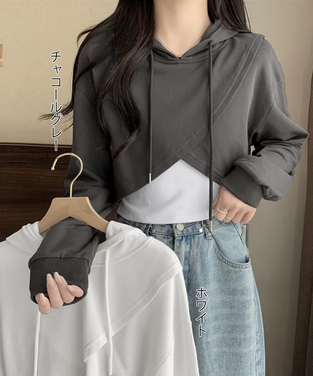 ショート丈フーディとインナーを組み合わせた、レイヤード2点セットトップス。