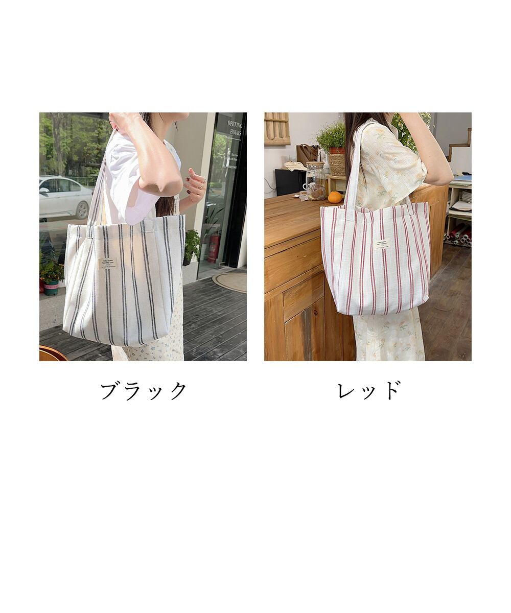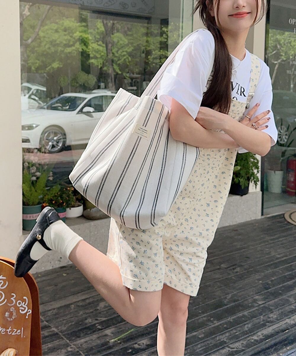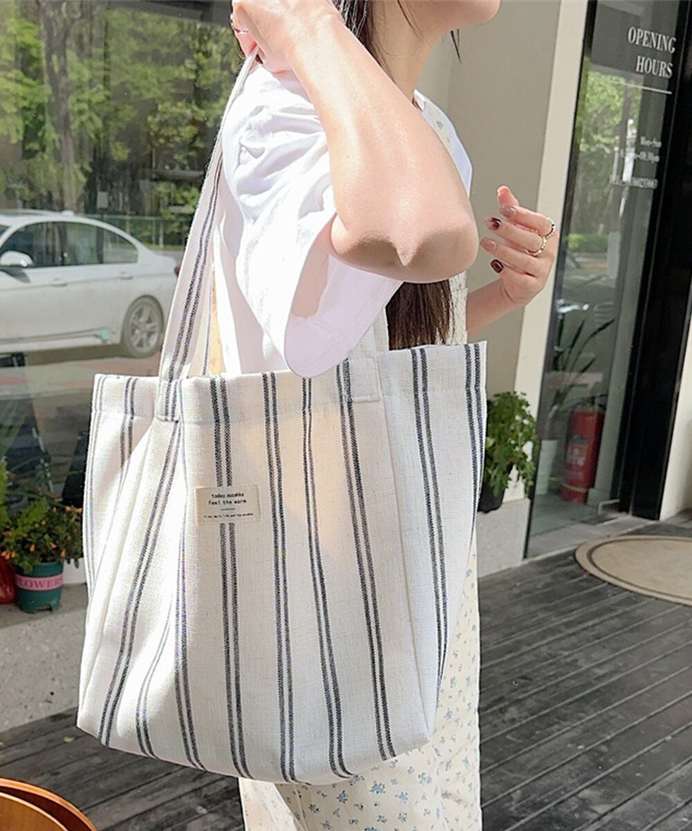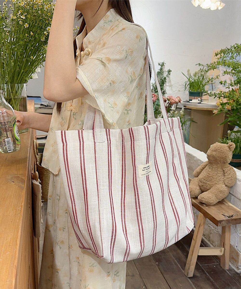 【日本倉庫即納】 トートバッグ 綿麻 ストライプ柄 韓国風