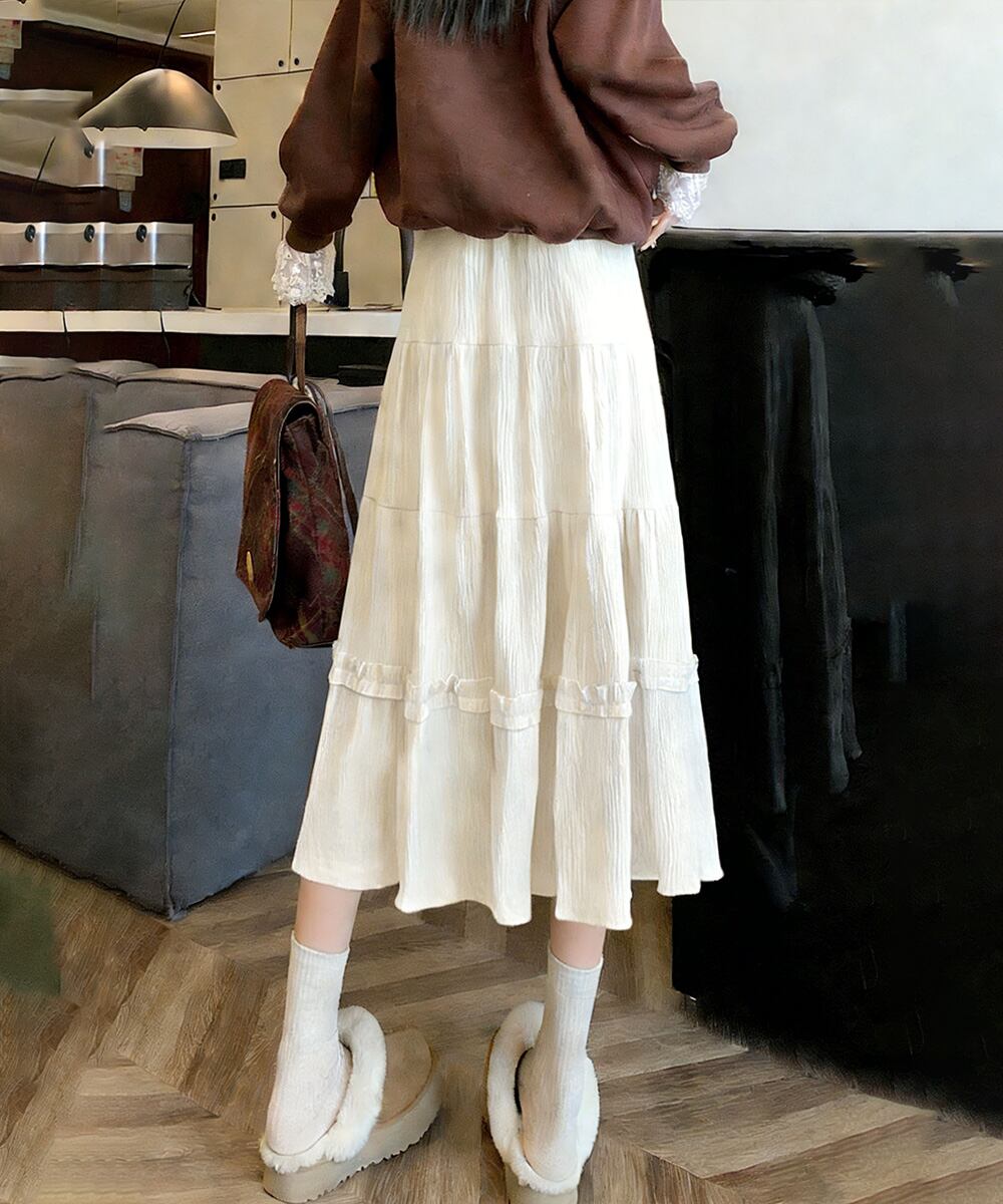 女性らしいフェミニンさを演出するティアードロングスカート。