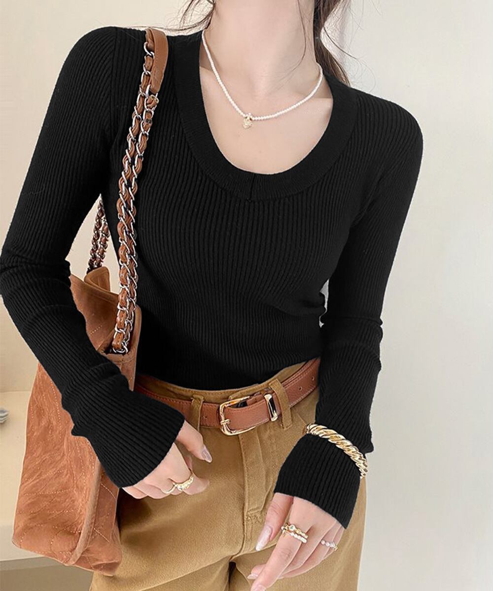 伸縮性のあるリブ素材で身体にほどよく寄り添い、すっきり見えるシルエットを演出。