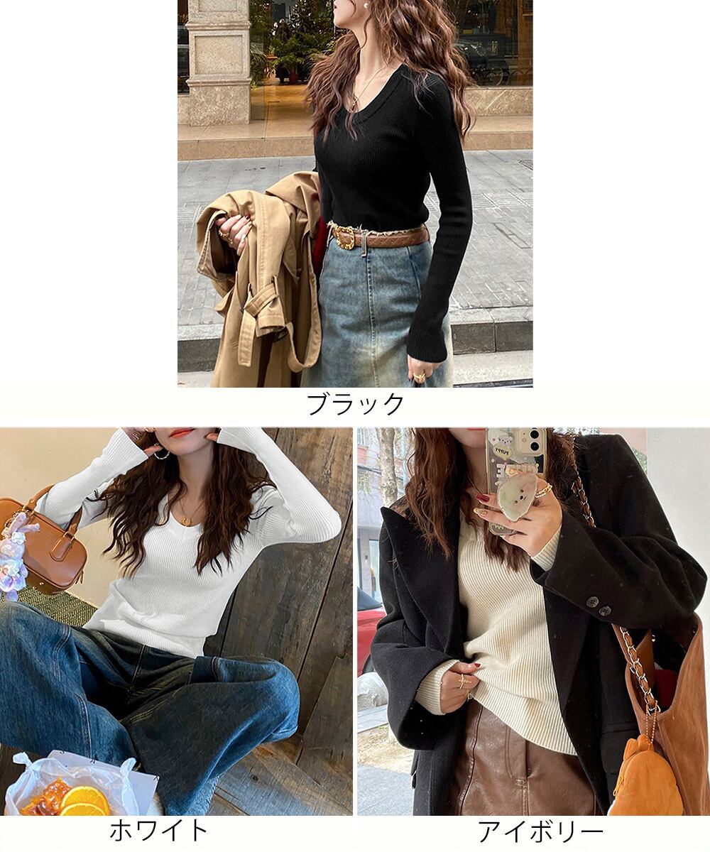 【日本倉庫即納】 裏起毛ニットトップス Vネックリブニット