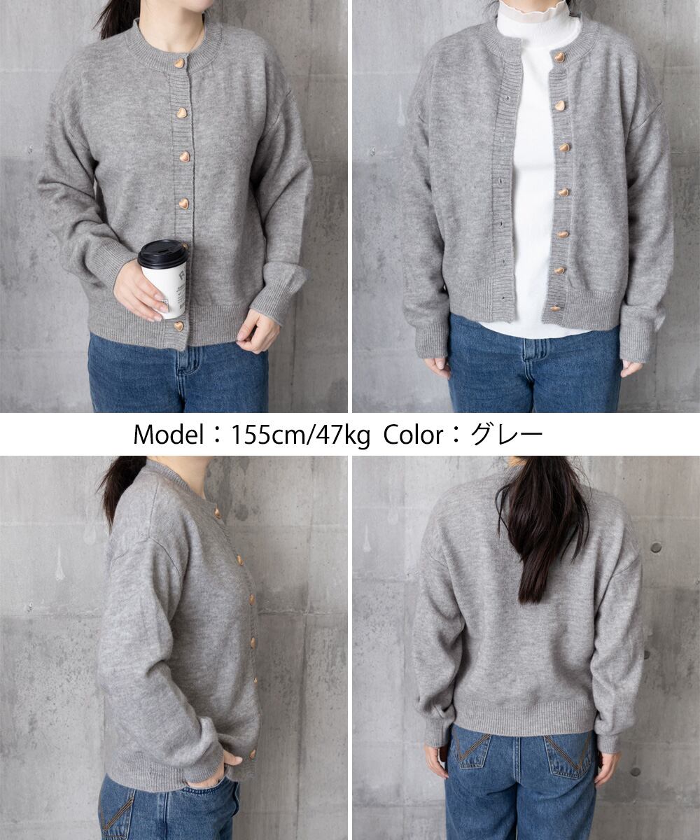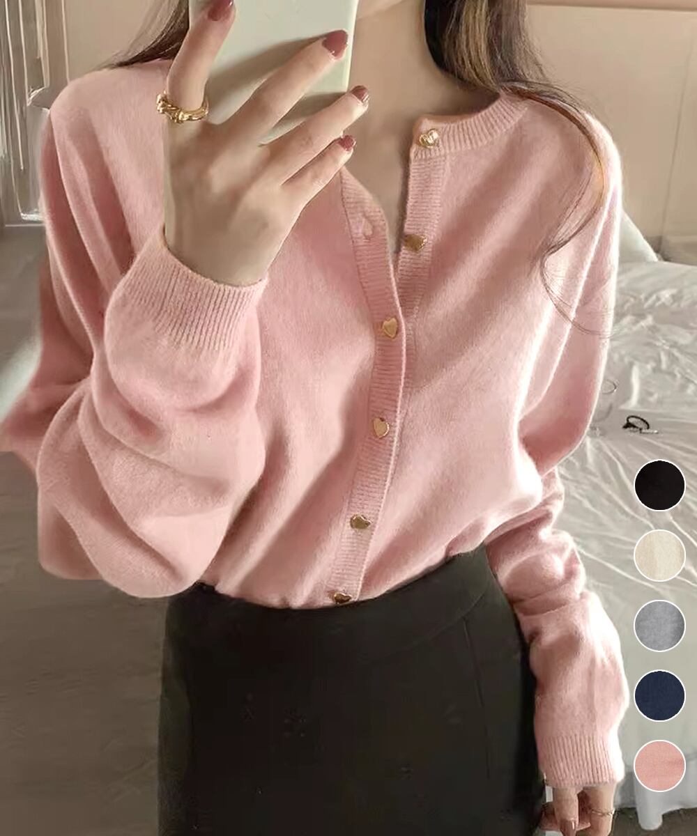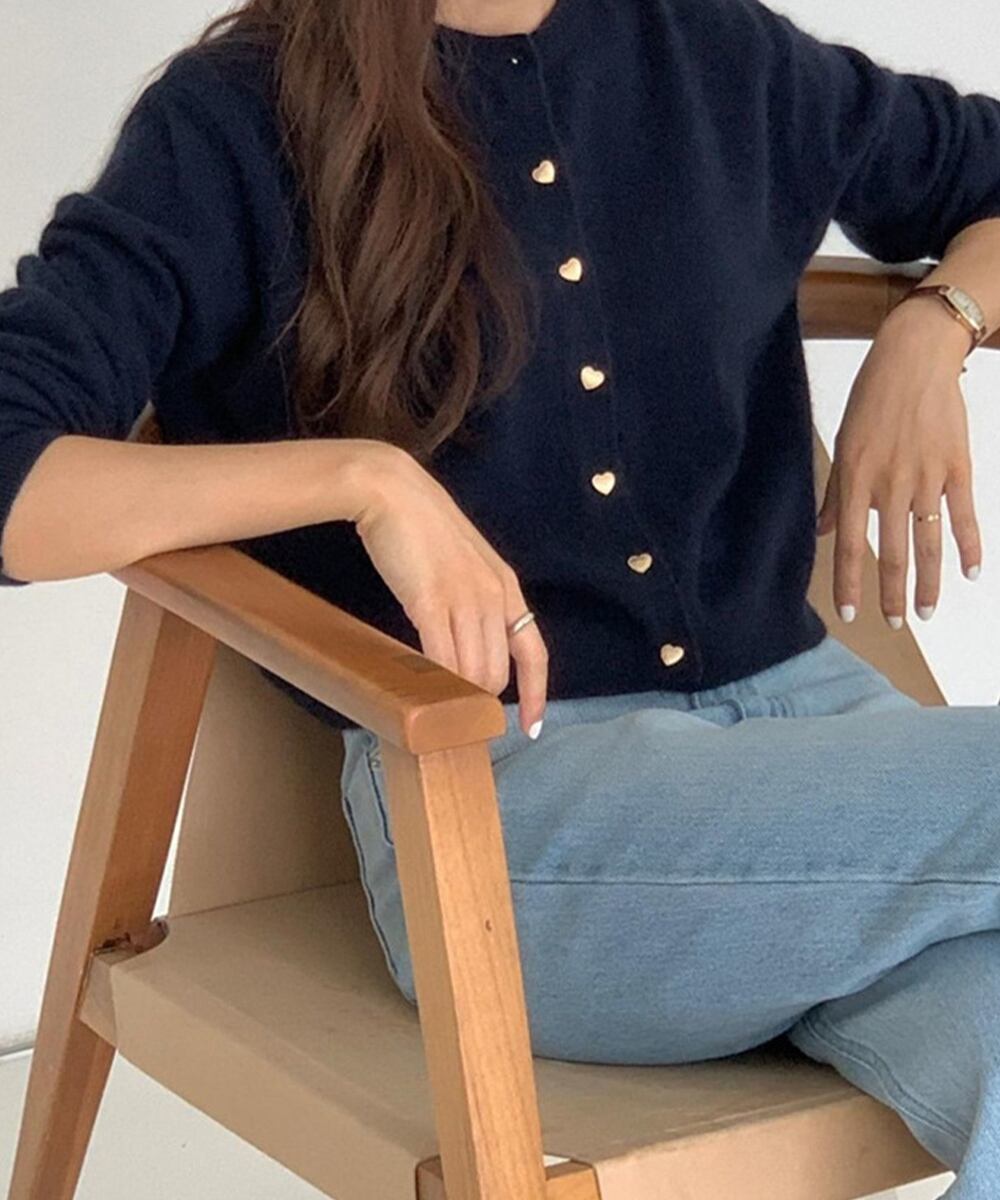 ハートボタンがさりげないアクセントになり、女性らしさを引き立てる一枚。
