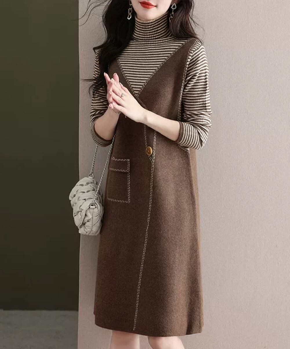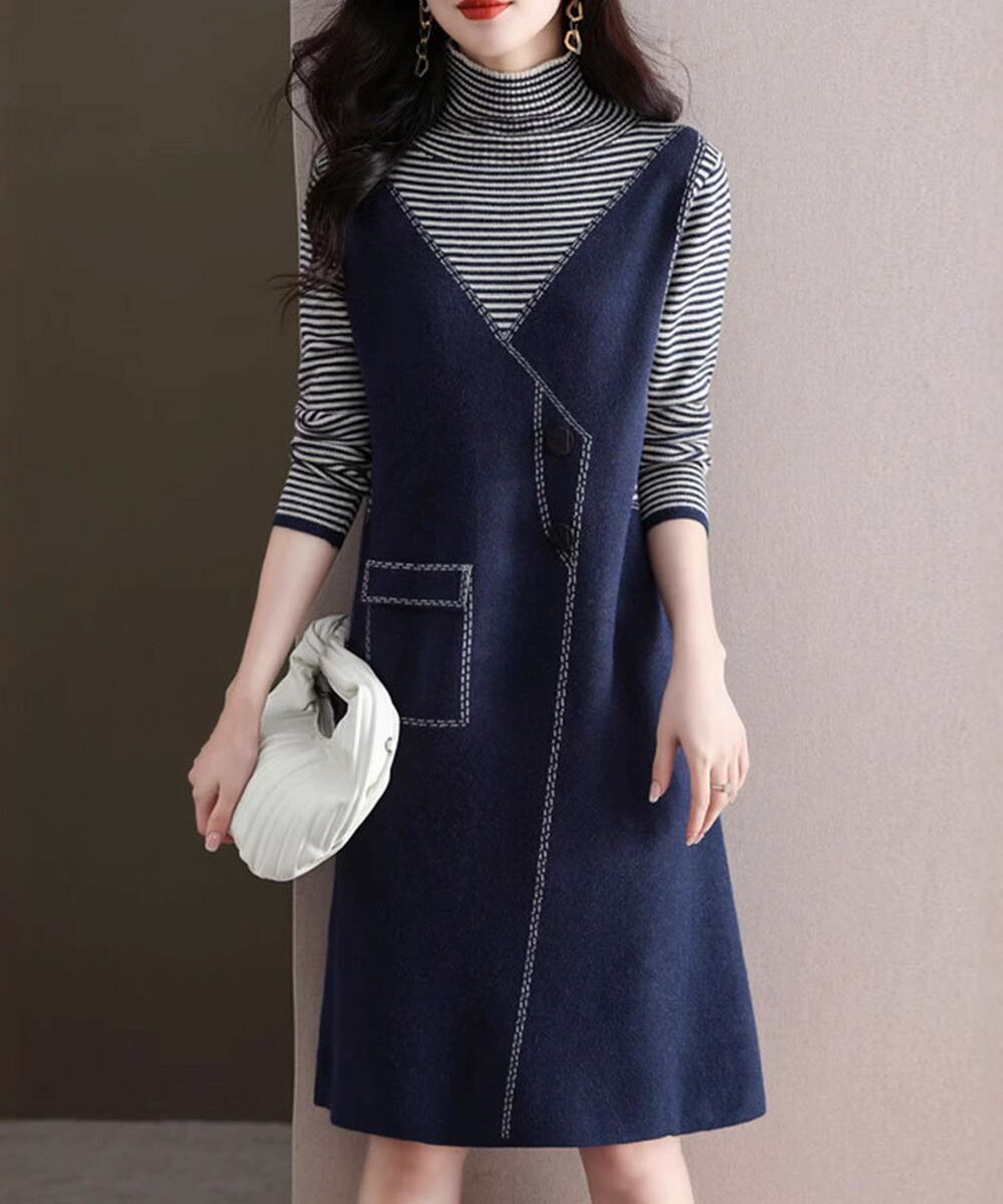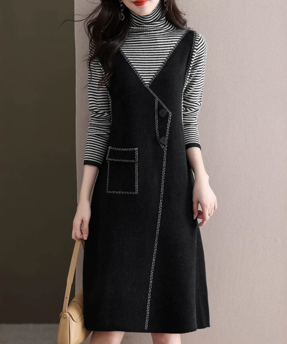 ハイネック ドッキングワンピ ボーダー柄切り替え 膝丈ワンピース 配色ステッチ 秋冬長袖インナーワンピ 大人可愛い着回し