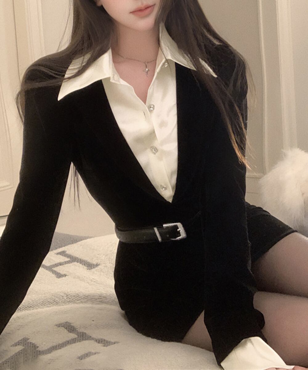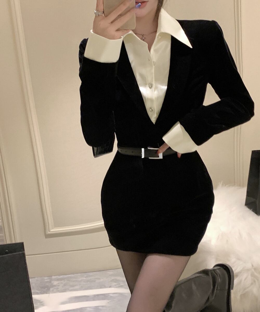 レディース バイカラー ベルト付きワンピース 異素材切り替えタイトワンピース レイヤード風 フィットワンピ ハイウエスト