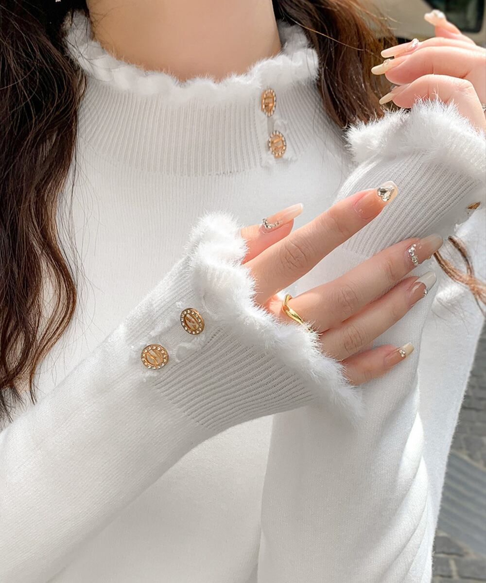 レディース 長袖ニットプルオーバー メロウフリルニットインナー厚手 ゴールドボタンニット金ボタン ぽかぽか暖かいセーター