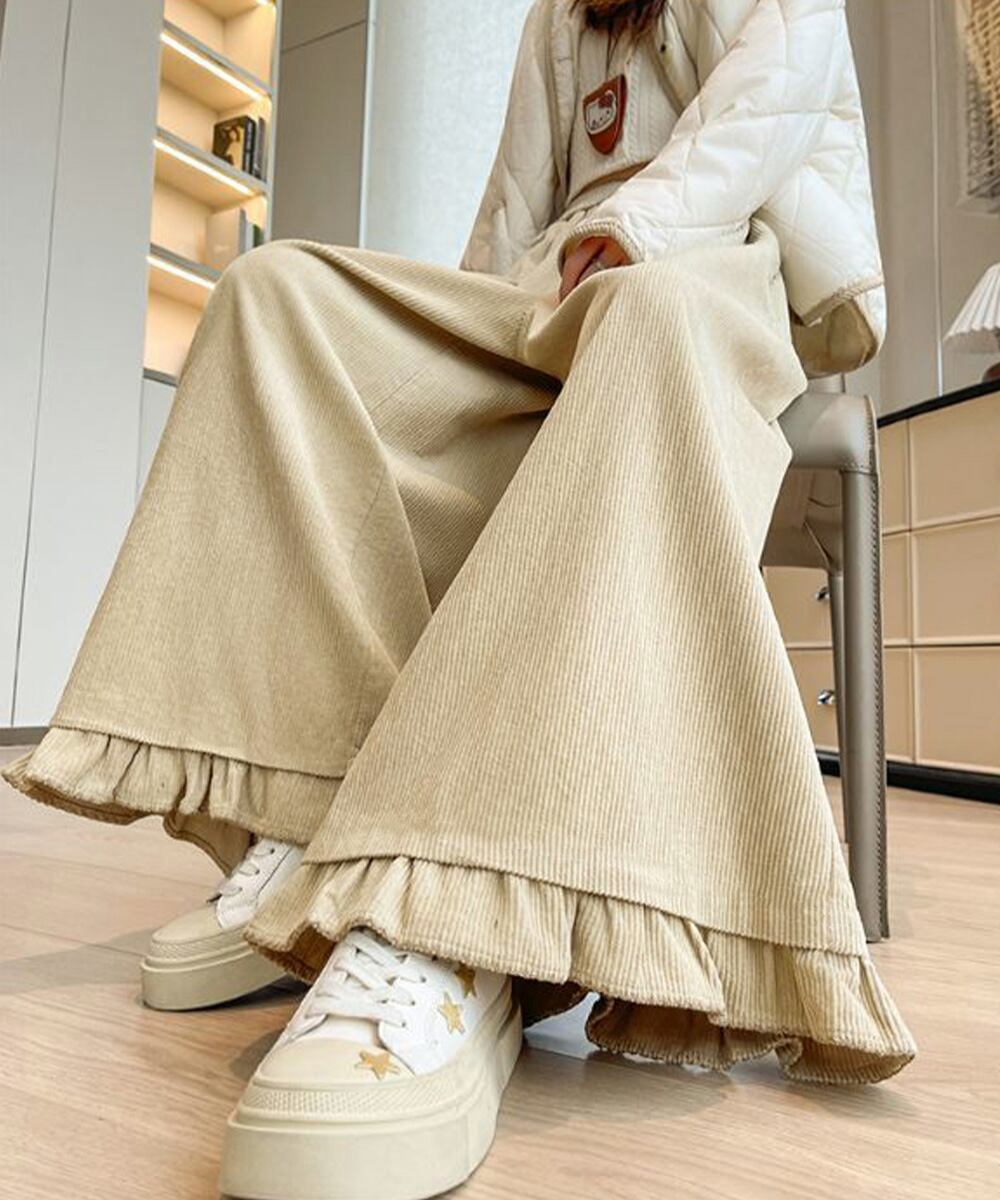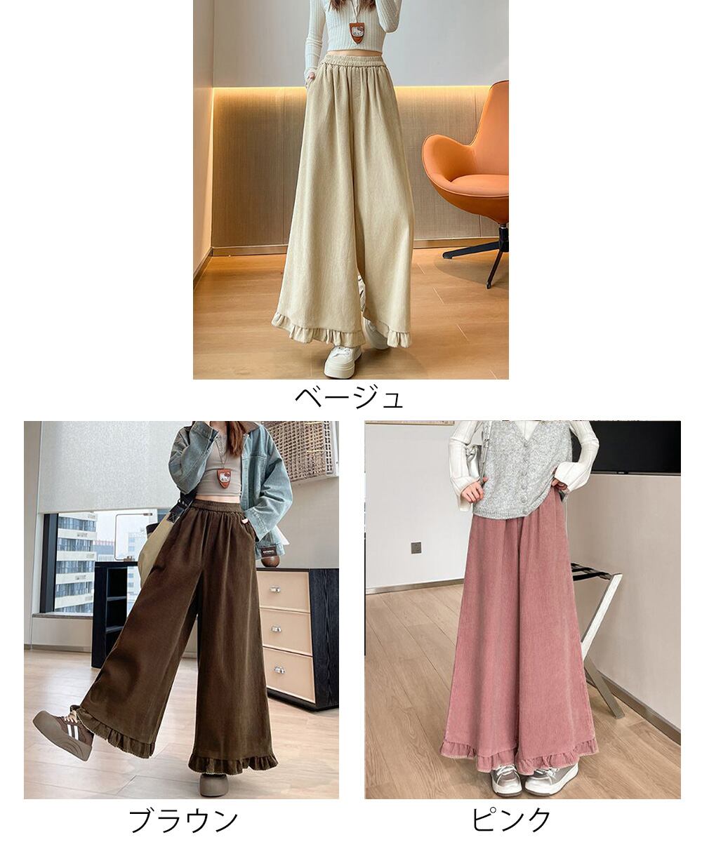 【日本倉庫即納】 フリル裾ワイドパンツ コーデュロイパンツ