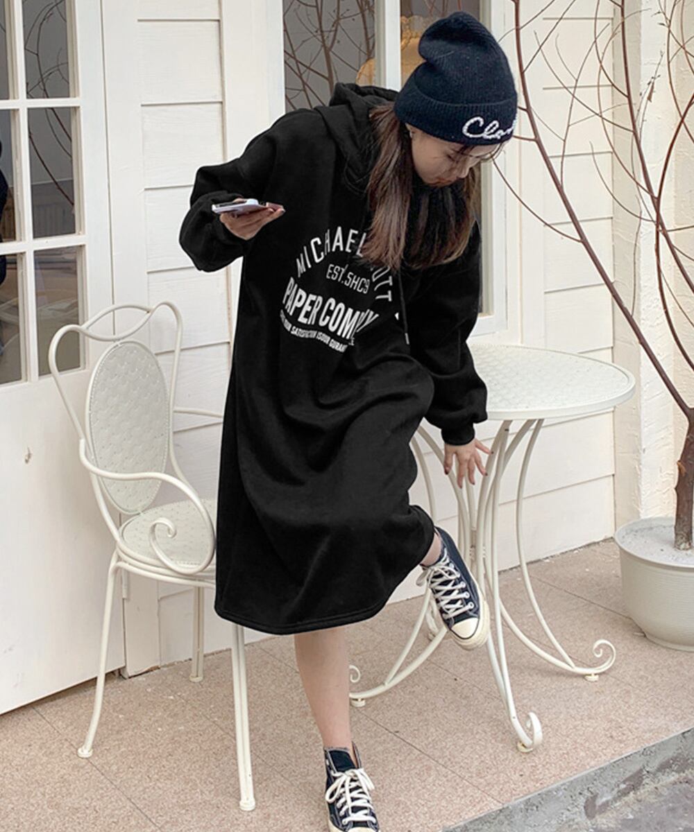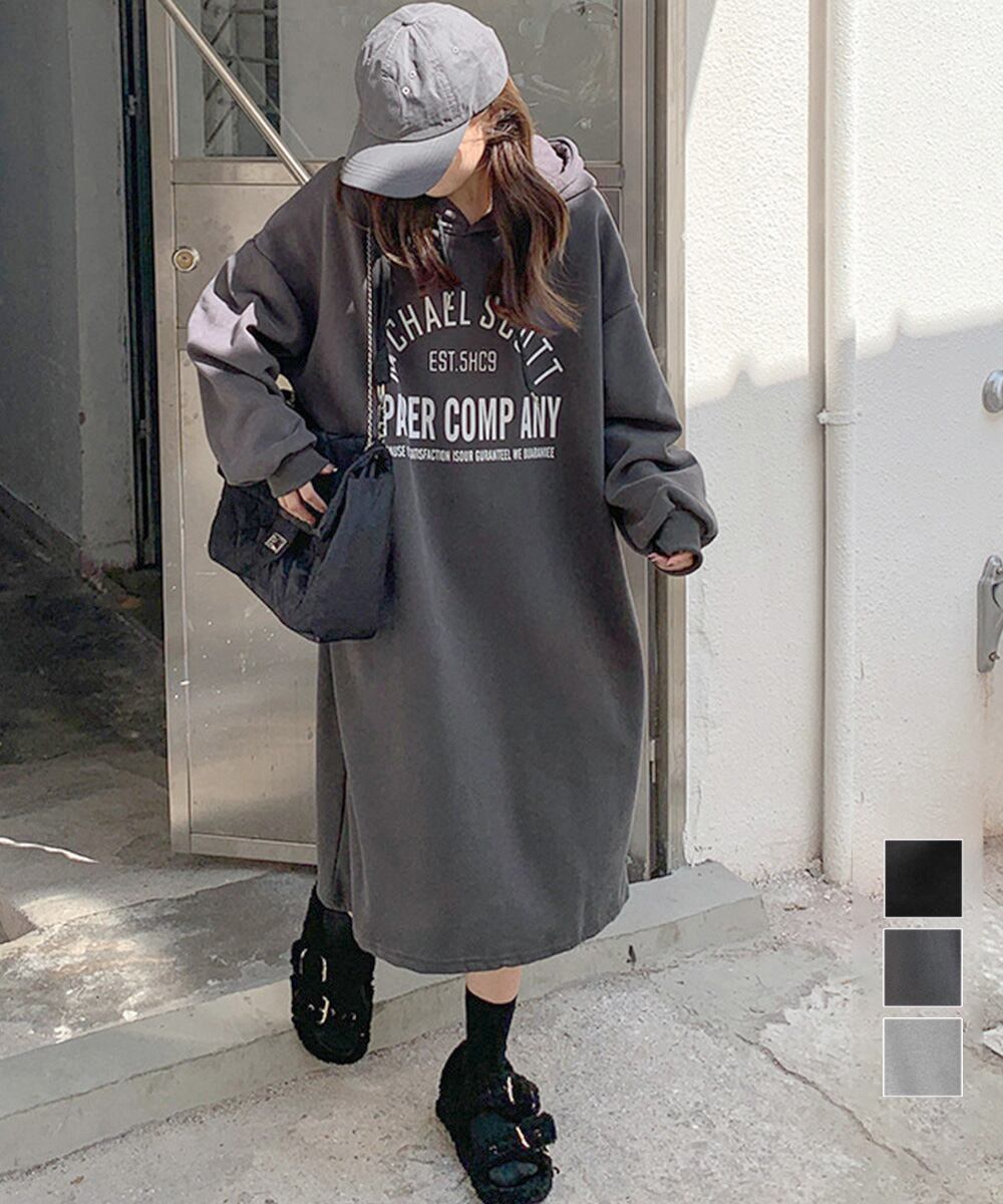 体型カバー ロゴプリント ゆるパーカーワンピース オーバーサイズ 厚手ワンピ 大人カジュアル ゆったりワンピース 着やせ