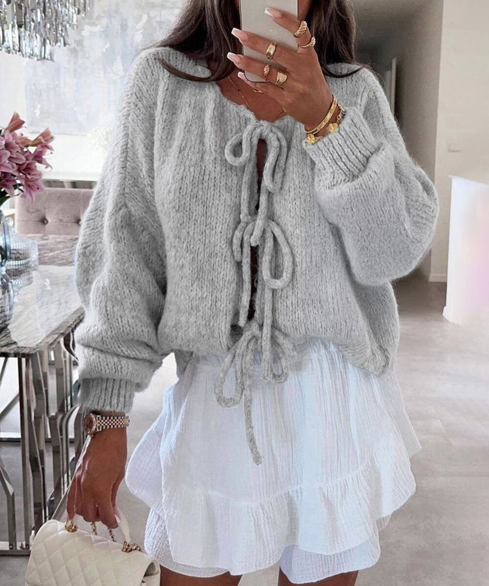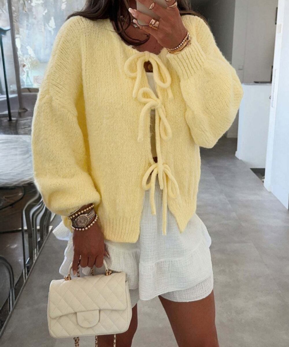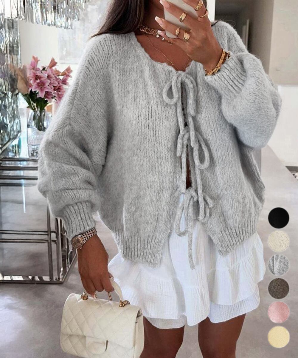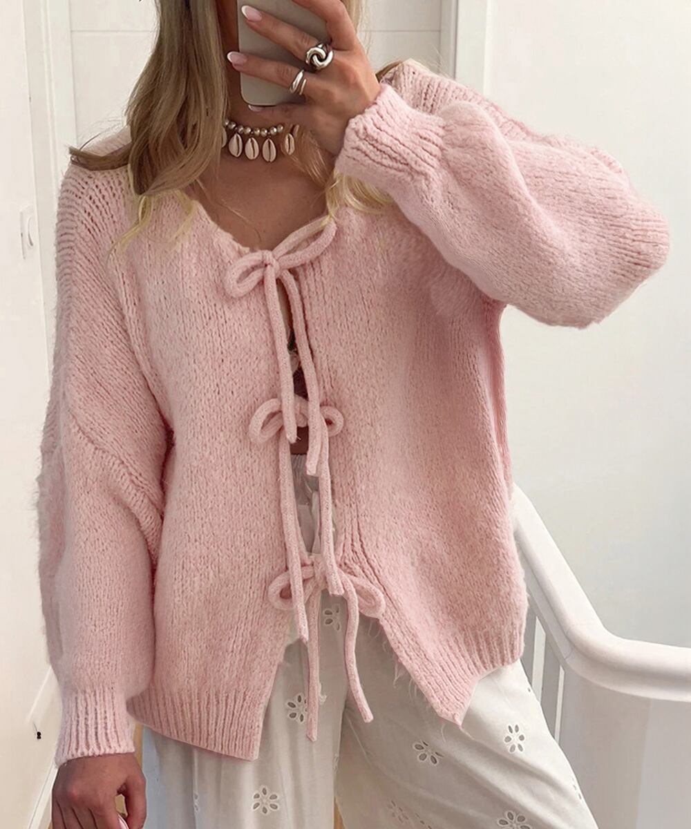 前開きニット羽織り リボンニット着やせ こなれ感ニット人気
