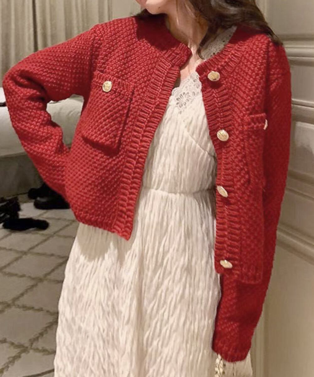 レディース ショート丈ニットカーディガン春秋 お洒落ニットトップス 大人可愛い長袖羽織り クルーネックきれいめカジュアル