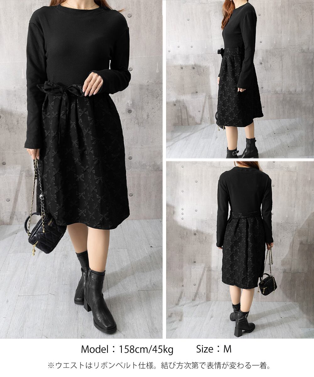 【日本倉庫即納】 リボン柄フレアワンピース ウエストマーク