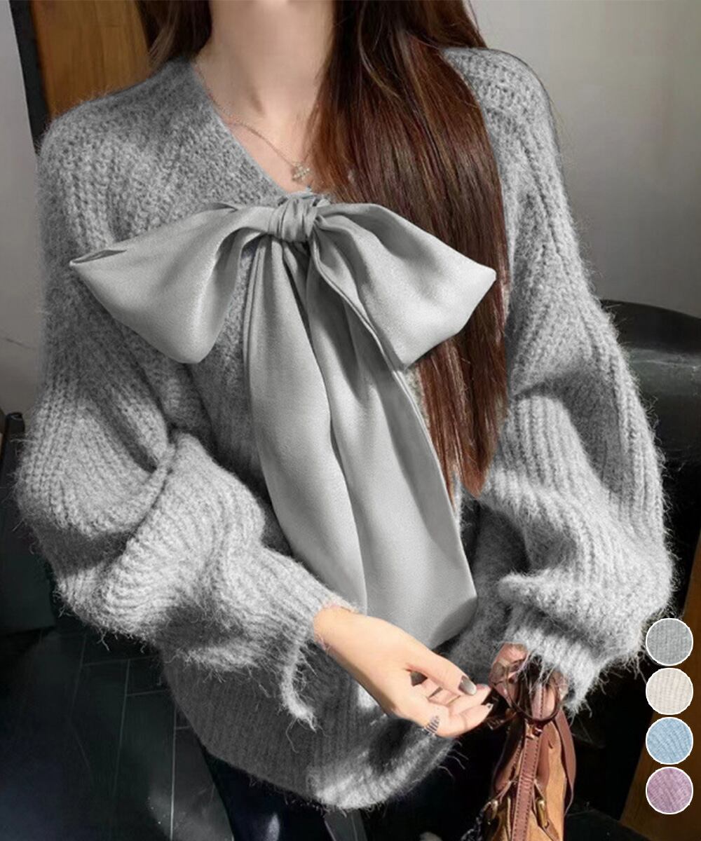 フェミニンニット春 リボン付きセーター 上品甘めニット秋冬