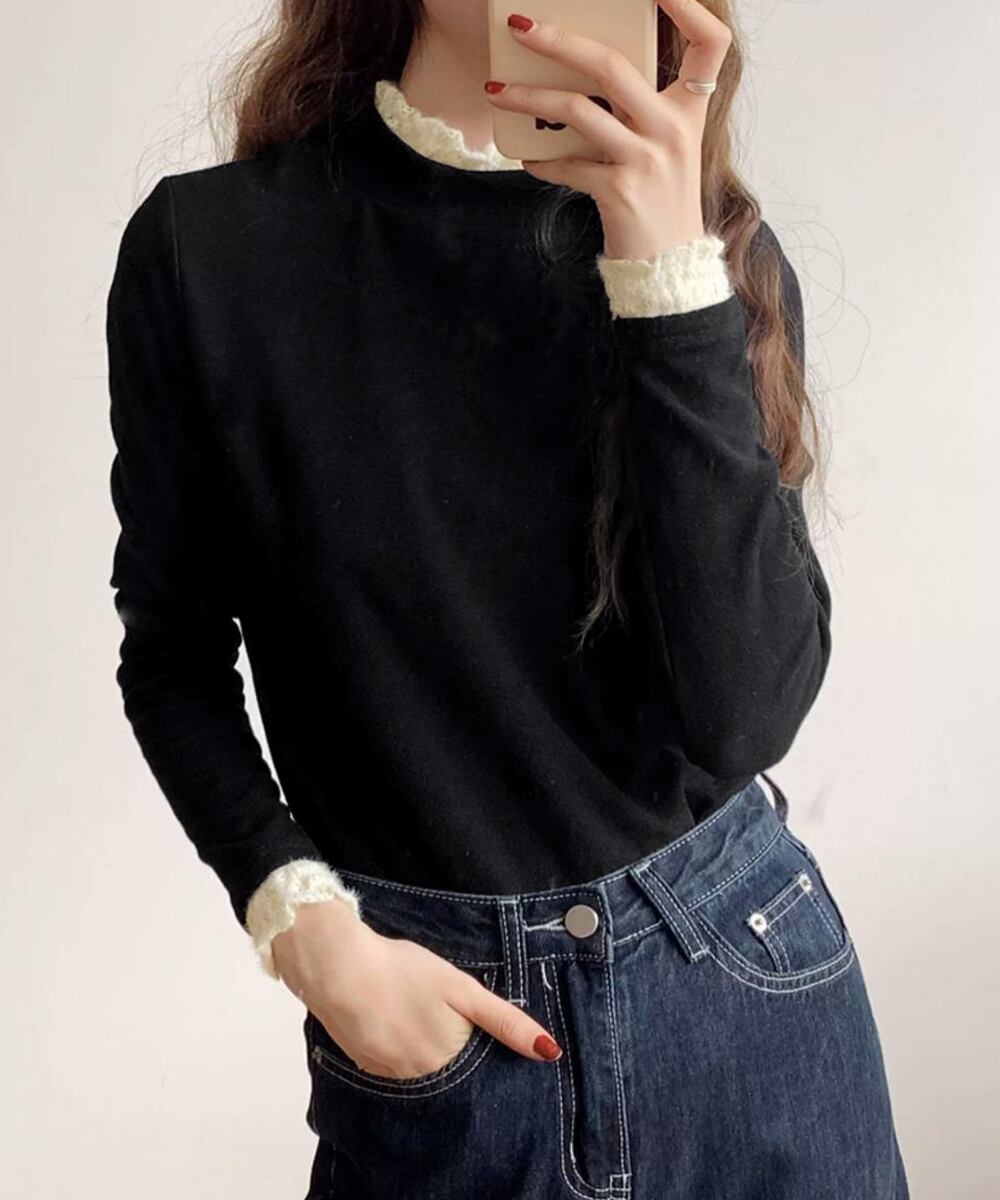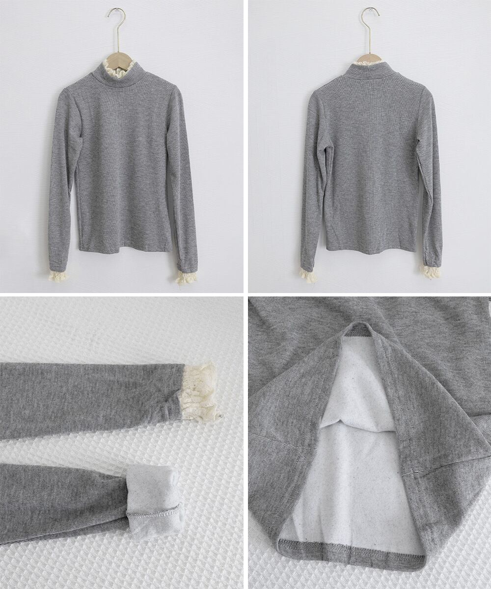 襟元と袖口に繊細なレースをあしらったハイネックリブニットトップス。