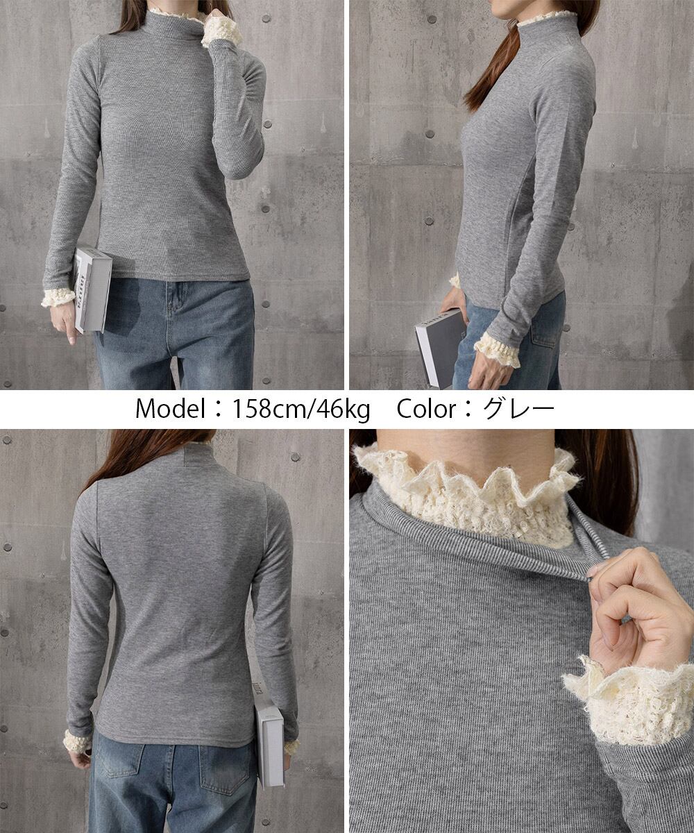 【日本倉庫即納】 レースフリル付きハイネックリブニットソー
