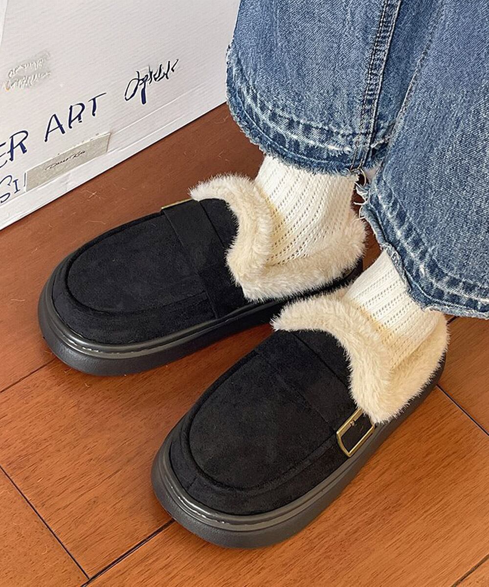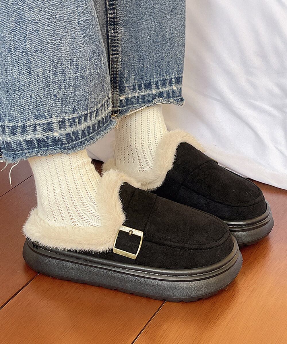 ふわふわファーを内側に施した、足元をあたためてくれるルームスリッパです。