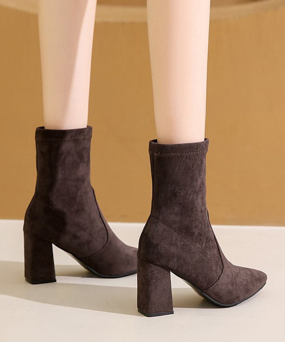 ポインテッドトゥ ブーティー美脚脚長 チャンキーヒール ミドルブーツ秋冬 レディース 太ヒール靴 歩きやすいブーツ高級感