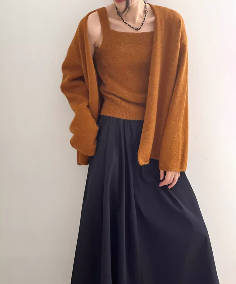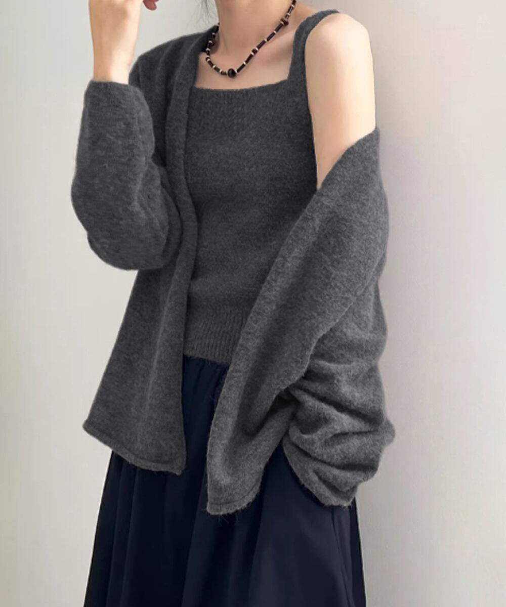 ベーシックなカーディガンとキャミソールの2点セットで、ひとつで重ね着コーデが完成。