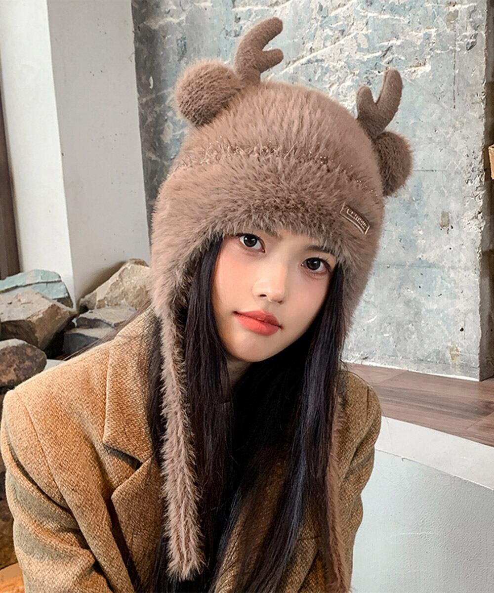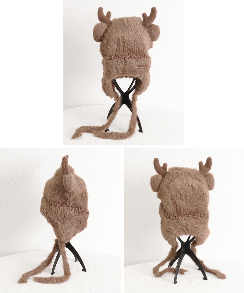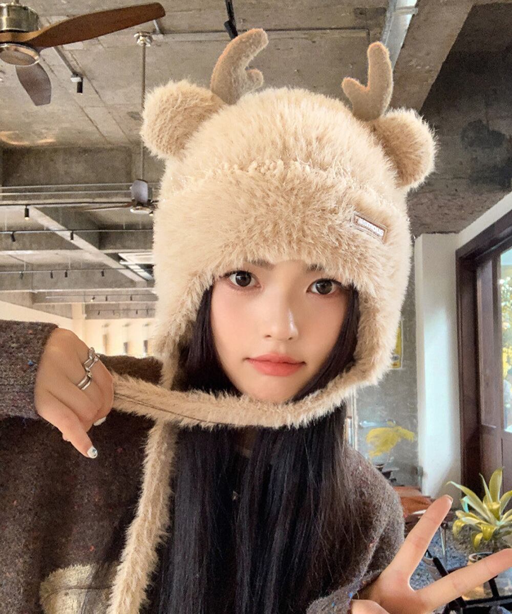 ふわふわ素材が可愛い、もこもこ鹿角とくま耳帽子。